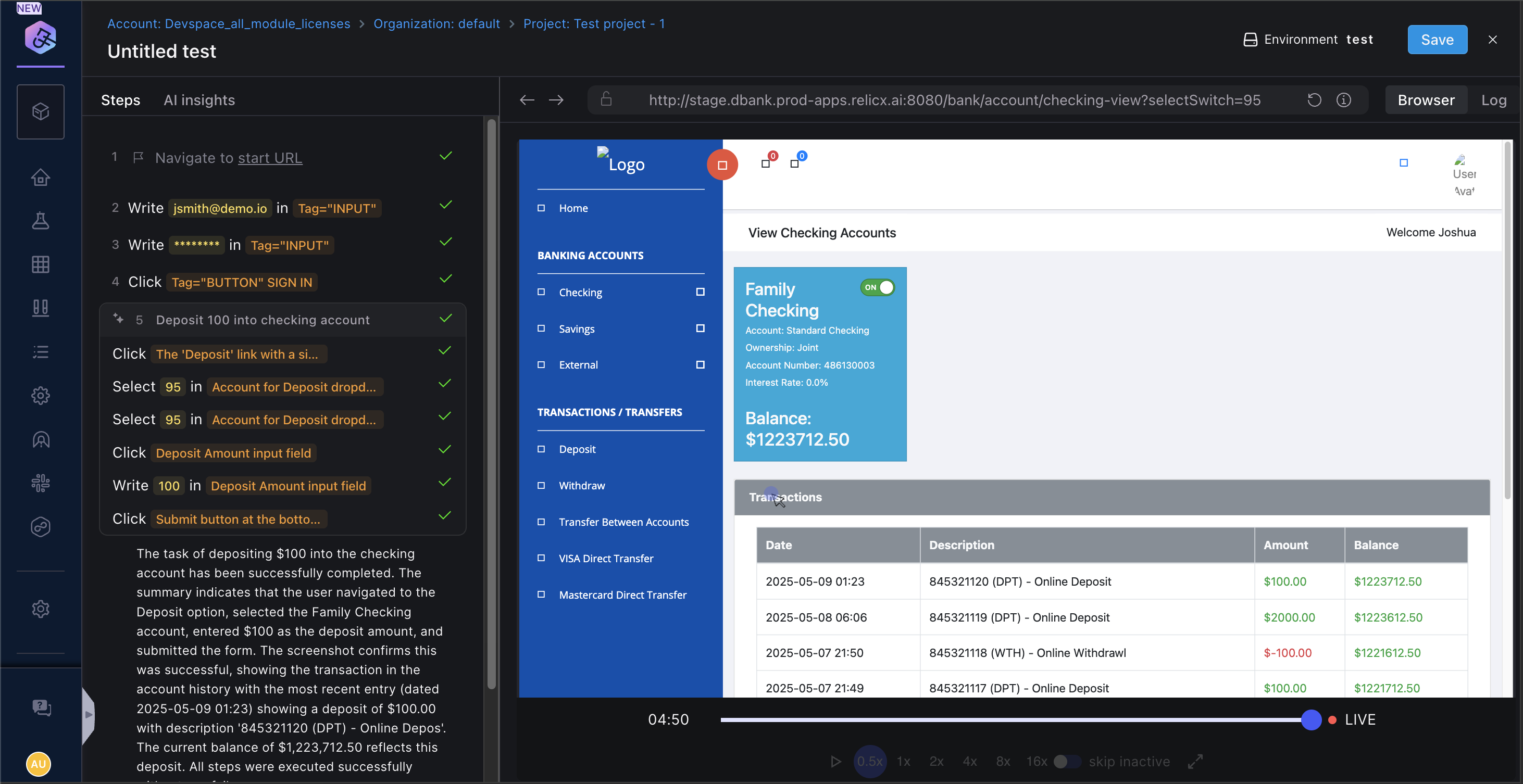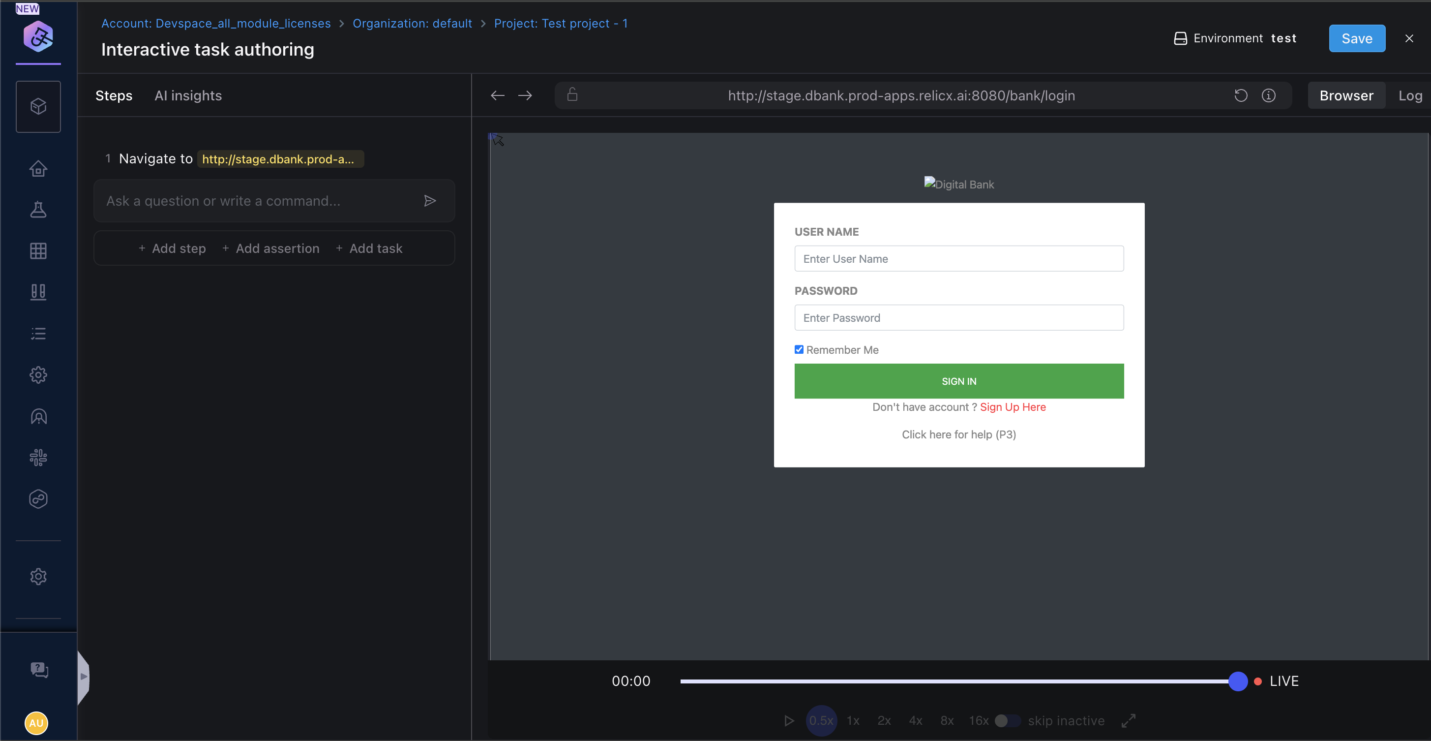Once on the trainer, you can interact with the browser or may also choose to enter a natural language prompt and start authoring a test.