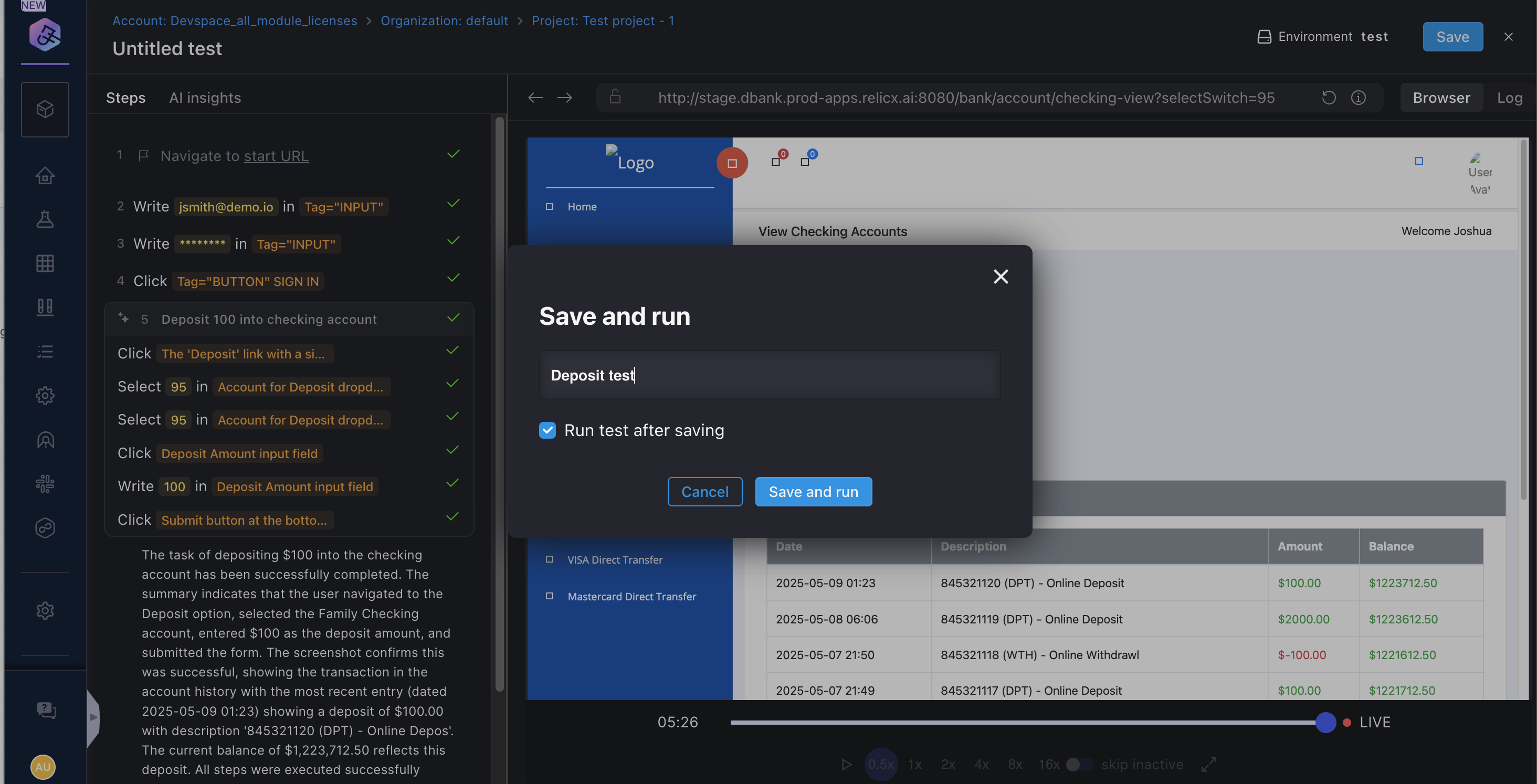 If you choose to run the test after save, it will be executed and you can follow the execution on the test run page