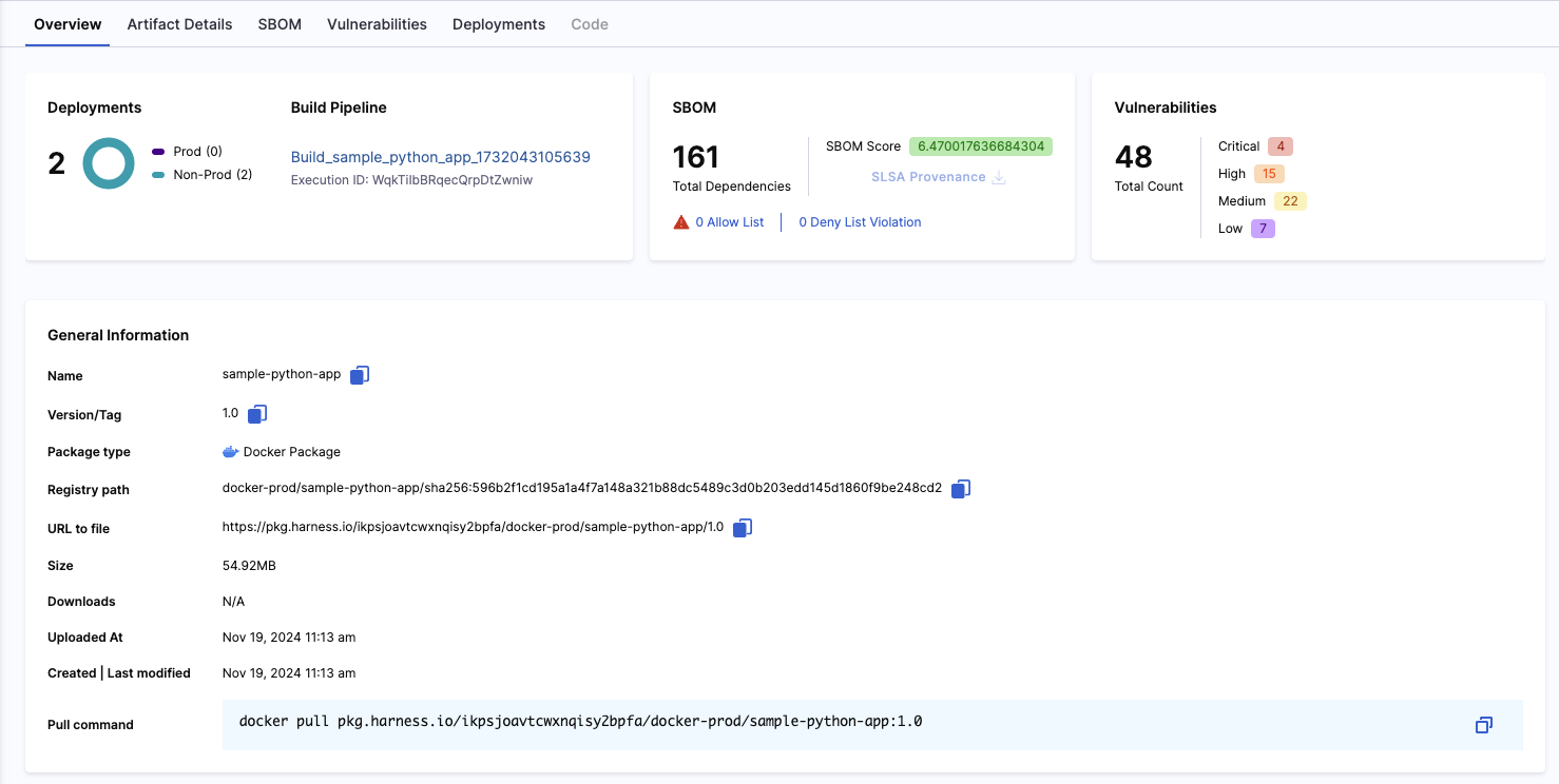 This section includes an overview of the artifact, offering a glimpse at all it's relevant information needed to manage it. Use this page to copy relevant information like the registry path or the pull command required to download the artifact.