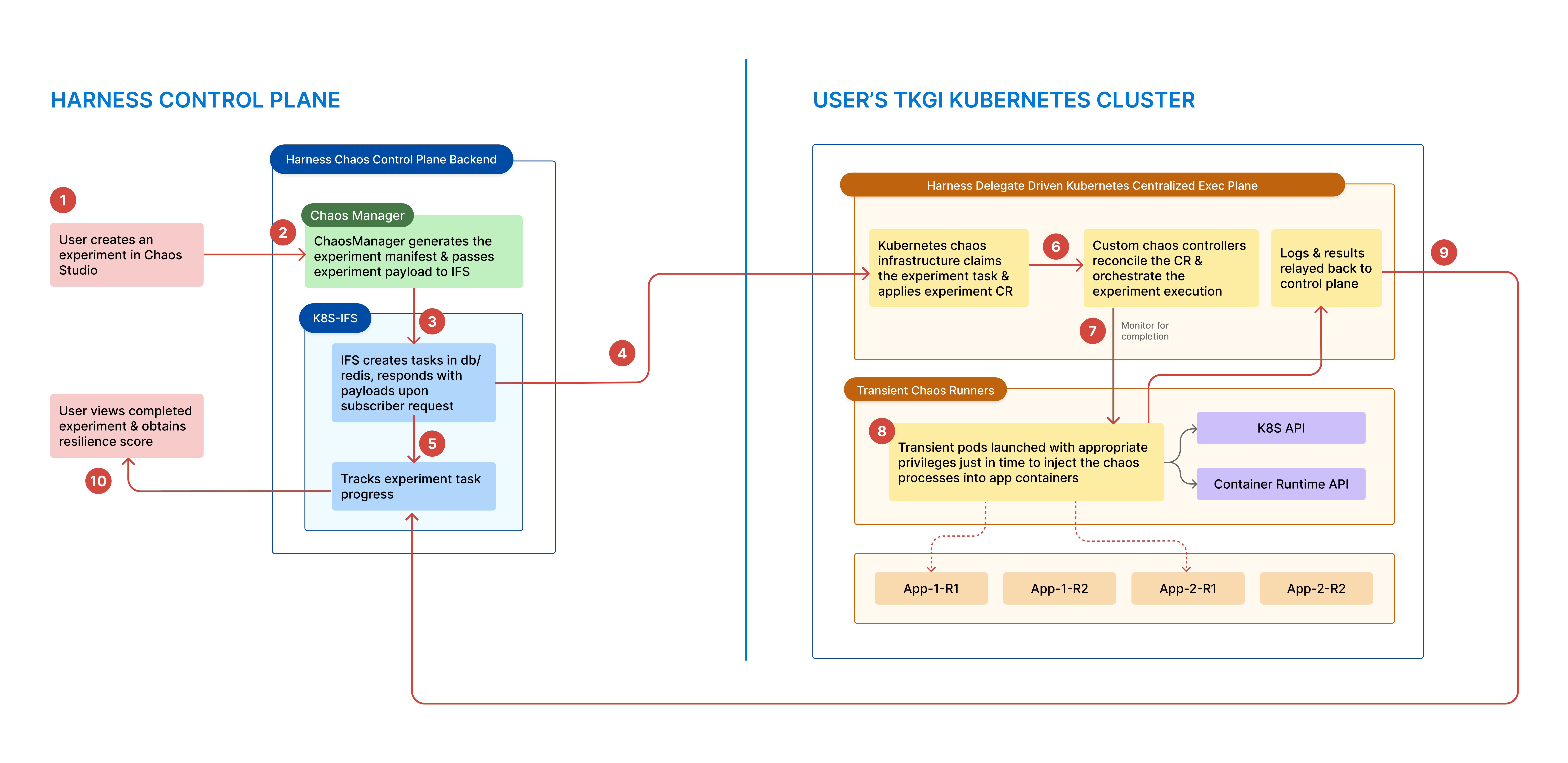 - Logs of these chaos pods are streamed to a log server in the chaos control plane for analysis.