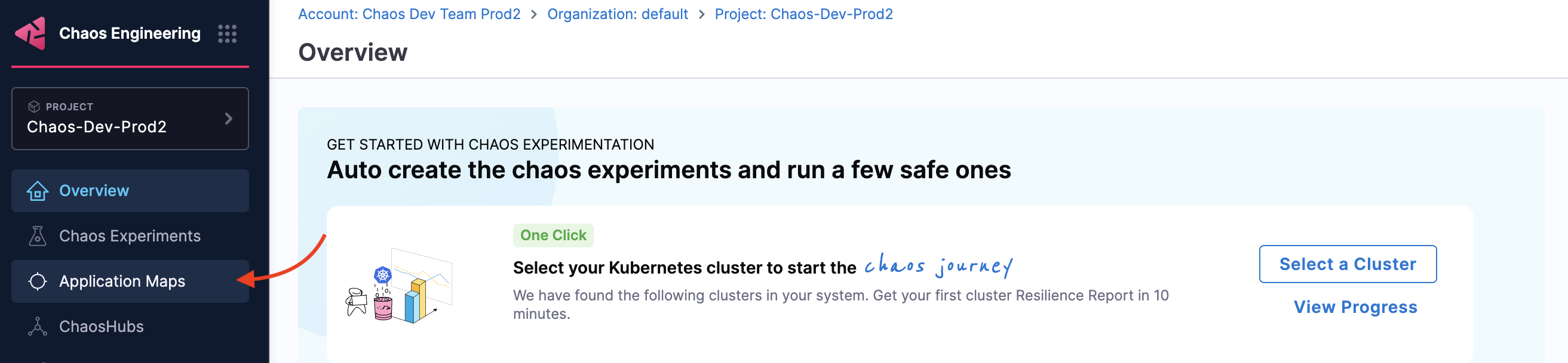 To view chaos-enabled experiment map, navigate to Chaos module and select Application Maps.