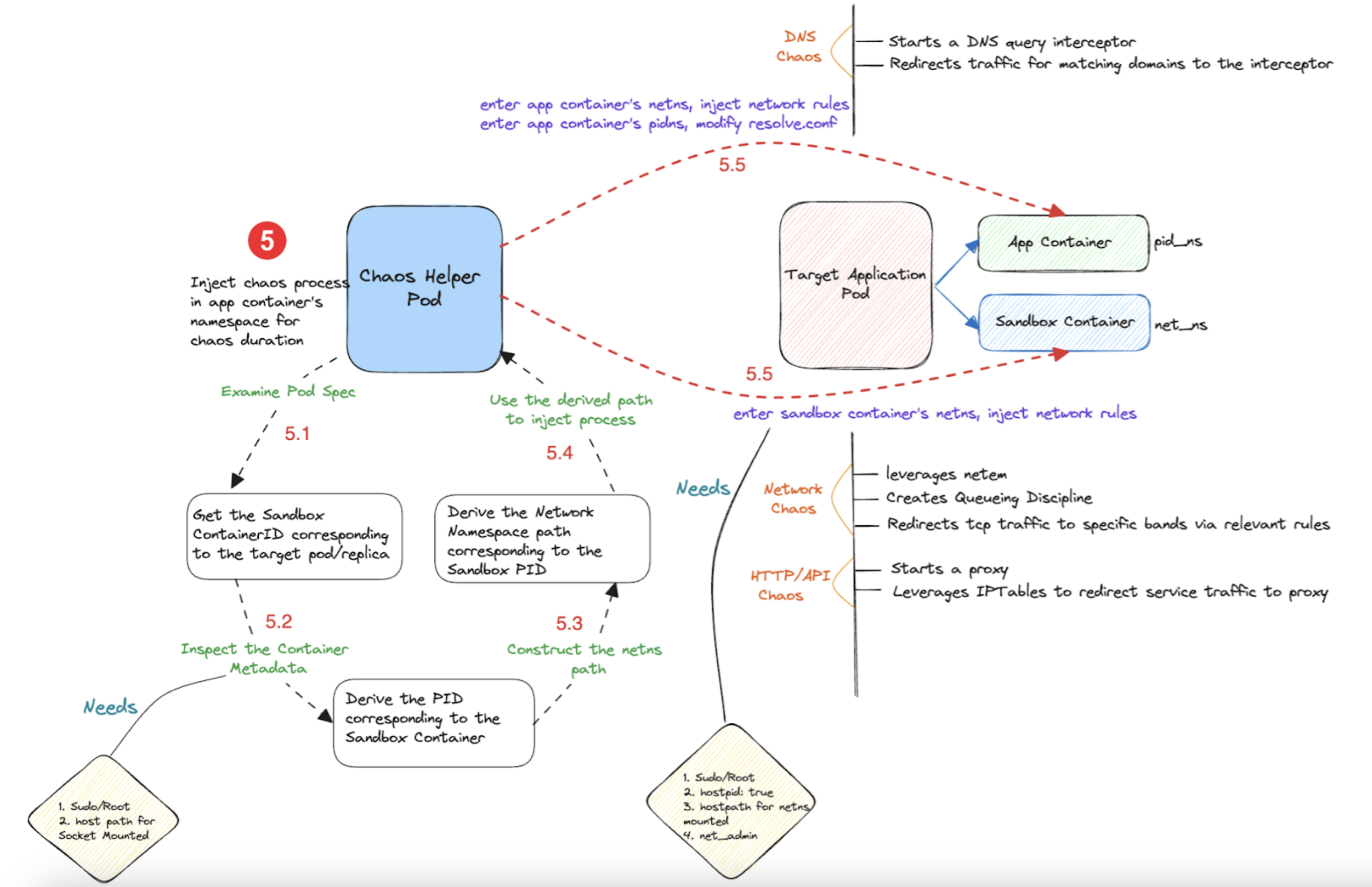 The diagram below describes the detailed flow of control (step 5 of the earlier diagram), for an example chaos experiment- pod DNS chaos.