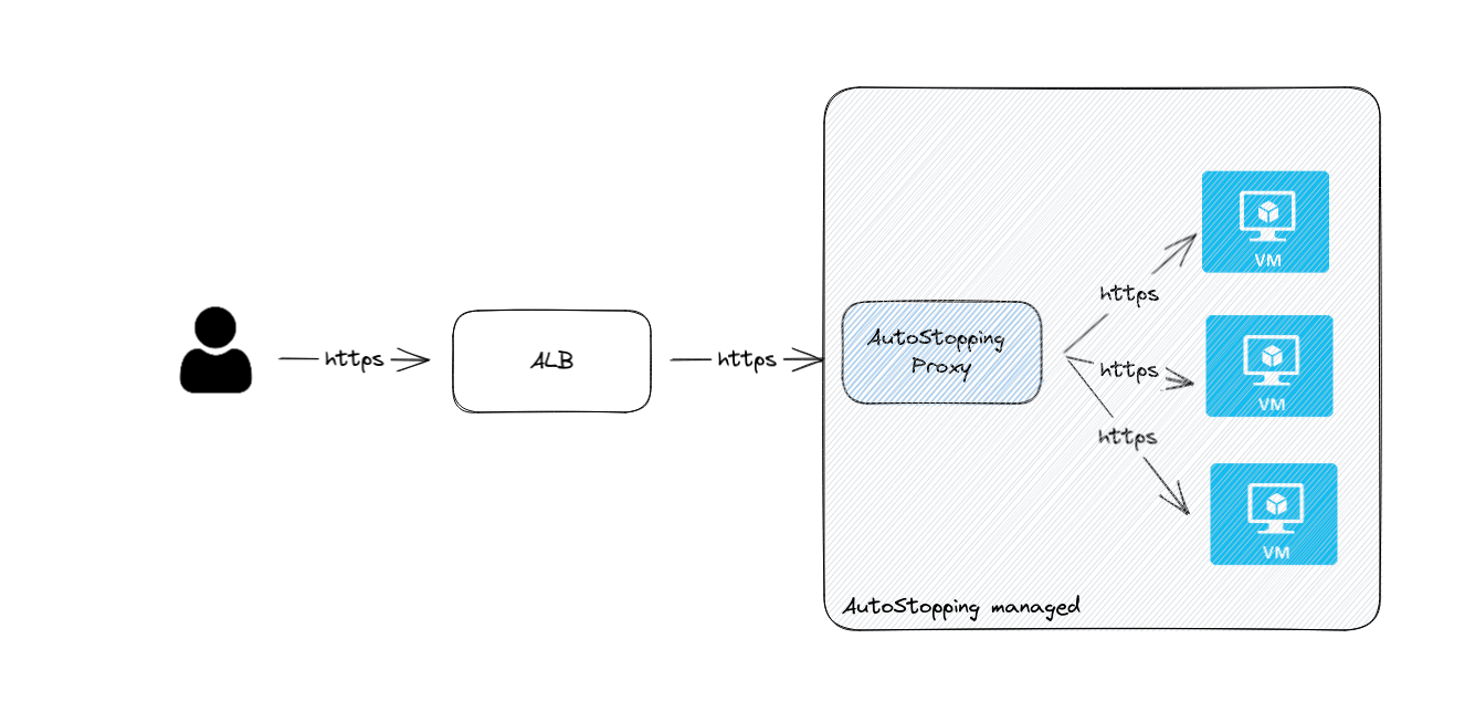 Learn how to configure an AutoStopping proxy as a downstream system of an Application Load Balancer in AWS, as illustrated by this network architecture diagram: