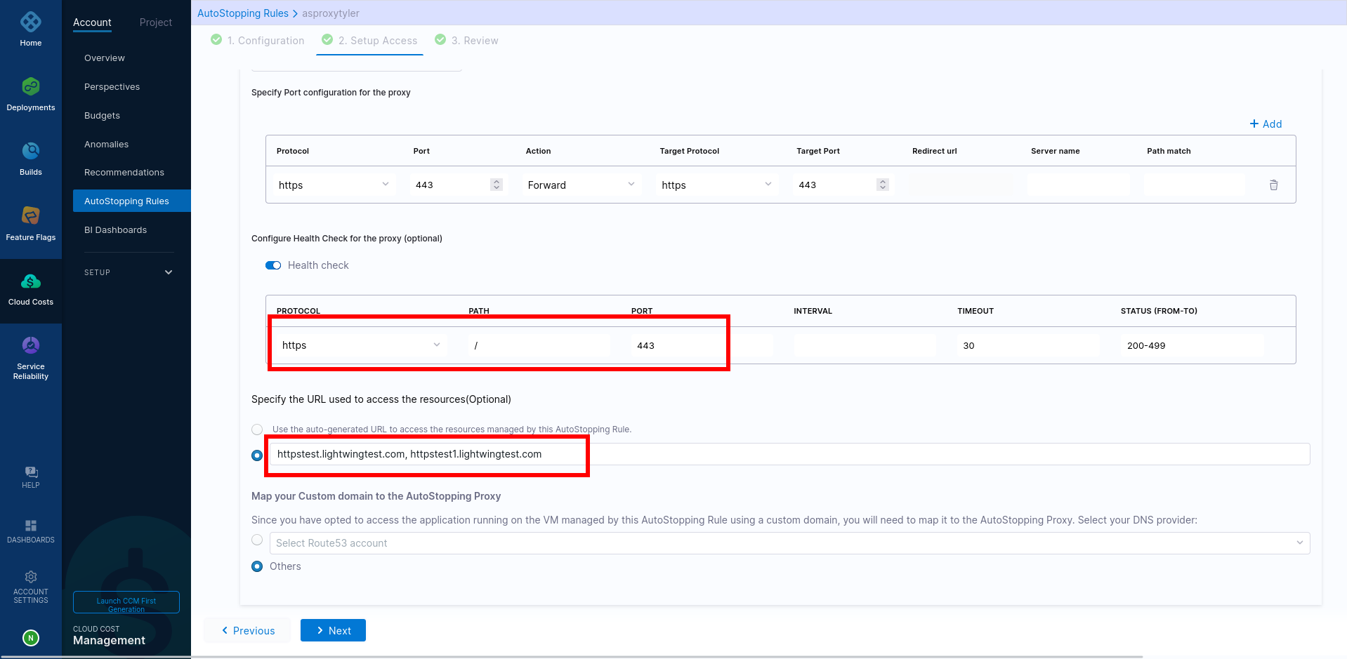 In Harness, create AutoStopping rule for AWS with HTTP/HTTPS workload and configure custom domains in the AutoStopping rule.