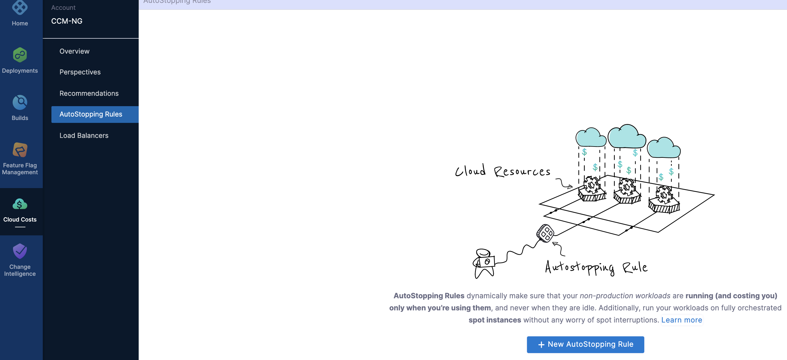 - In Cloud Costs, in AutoStopping Rules, click New AutoStopping Rule.