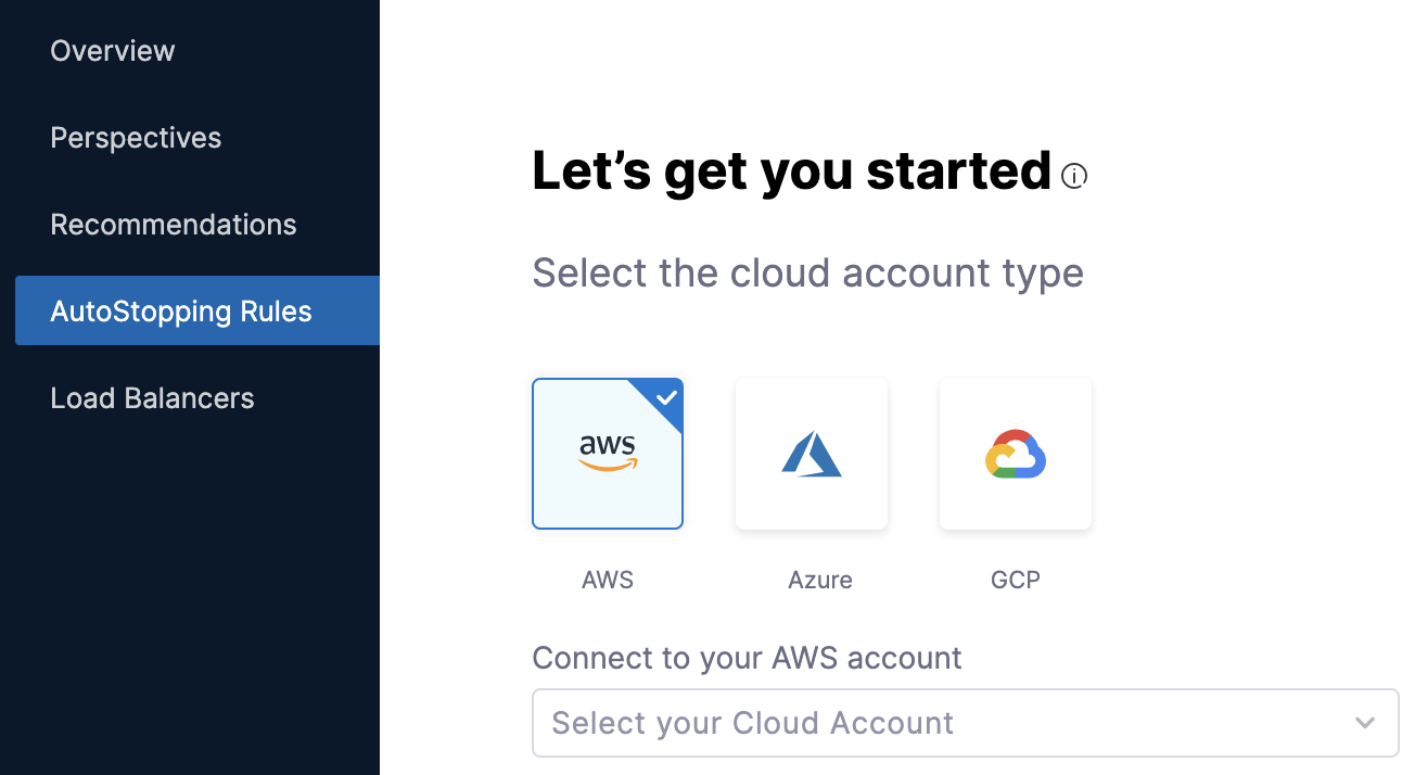 - In the cloud account type, select your cloud account. For example, AWS. It is the cloud account in which your workloads are running that you want to manage using AutoStopping rules.