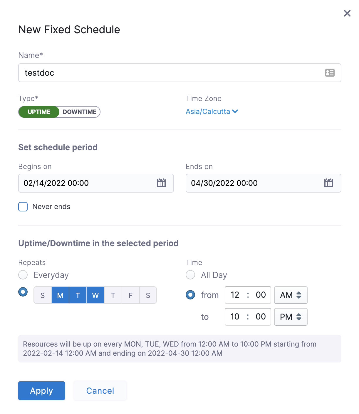 In the following example, resources will be up every Mon, Tue, Wed starting from 12:00 a.m. on February 14, 2022 till April 30, at 10:00 p.m. Example 2: Example 2: