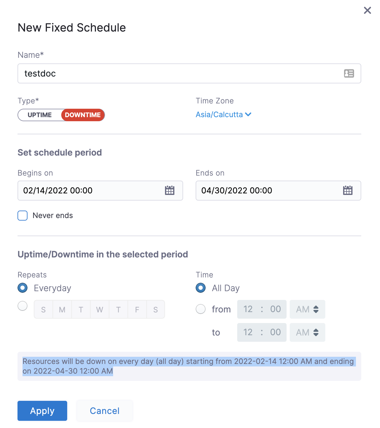 In certain scenarios, you would not want your resources to go down or up. For example, every Friday at 5 p.m. you want your ABC resource to go down. You can schedule downtime for your ABC resource. During this window, the resource will be forced to go down regardless of the defined rule. You can choose to specify uptime for your resources in the same way.