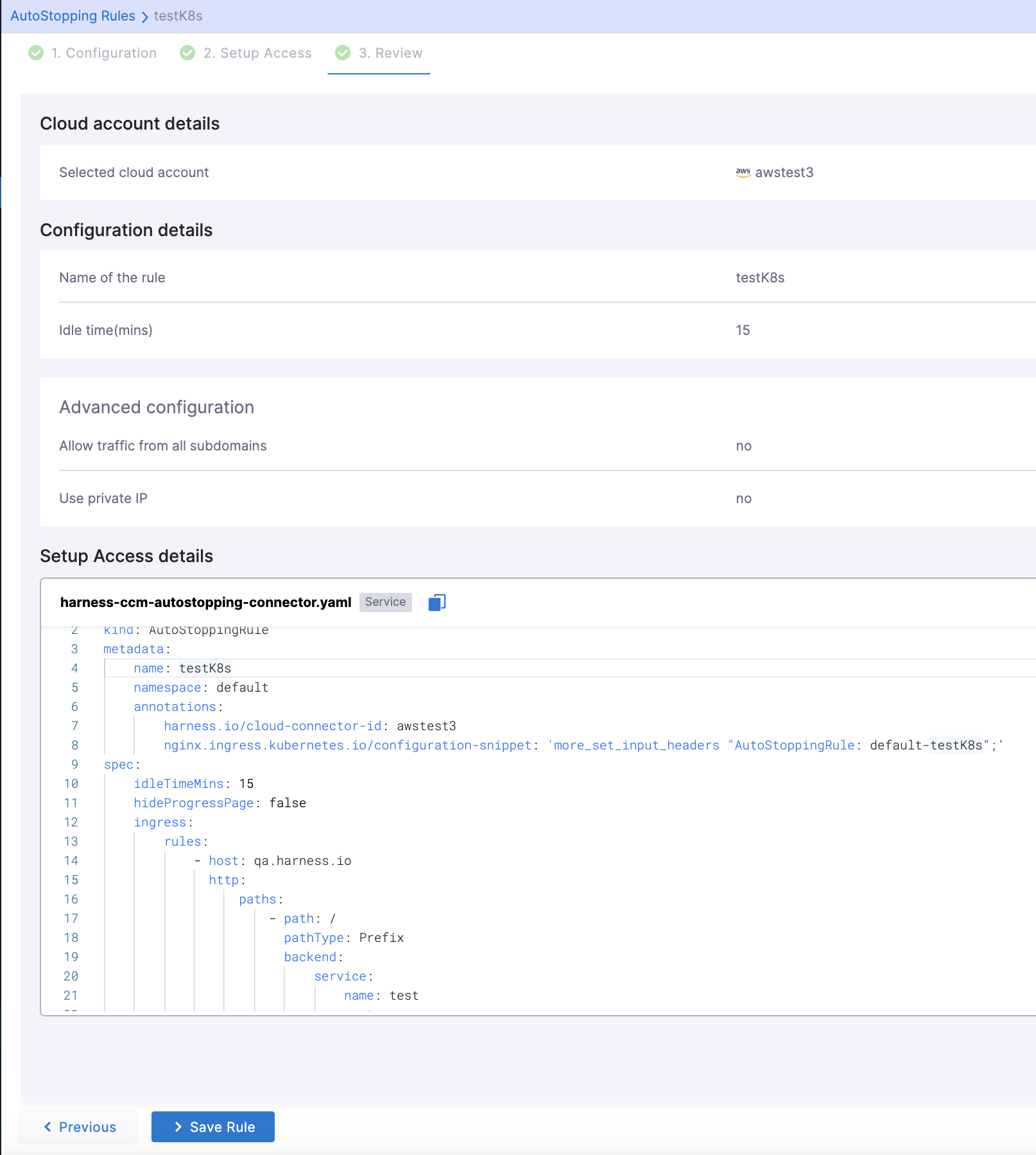 For the detailed steps, see Create a Kubernetes Connector for AutoStopping Rules.