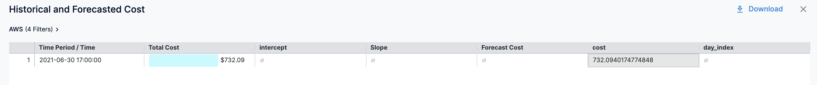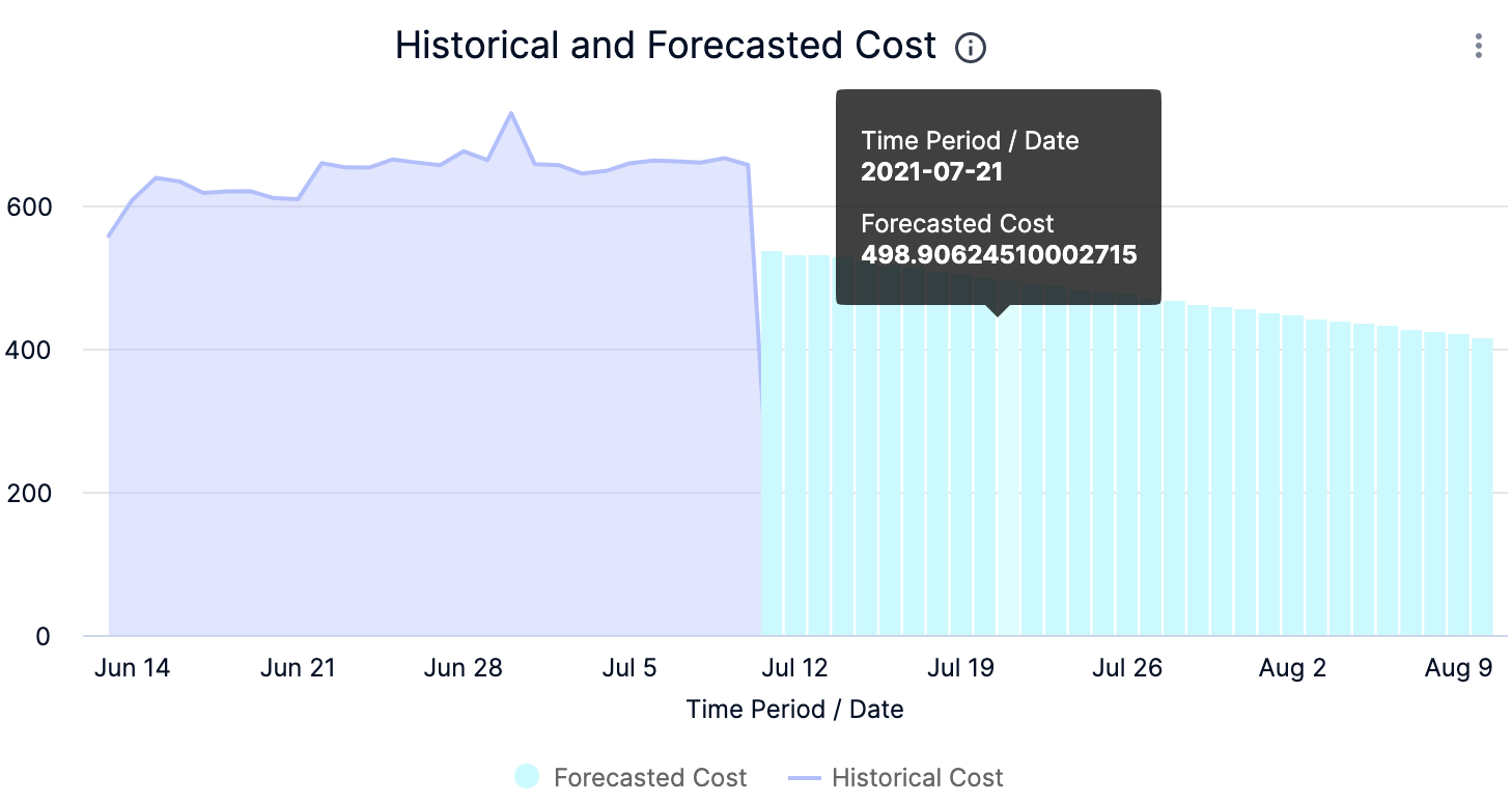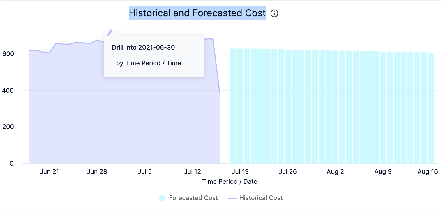 | Forecasted Cost | The forecasted cloud cost with cost trend. Forecasted cost is the prediction based on your historical cost data, and it is predicted for the same future time period as your selected time range. |  |