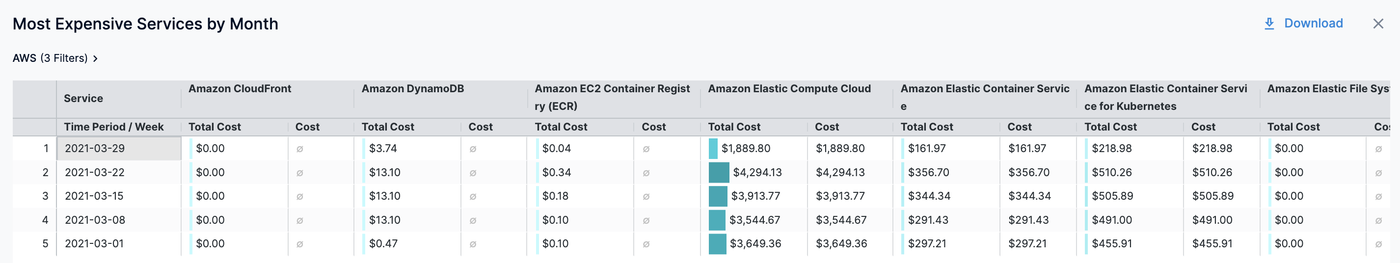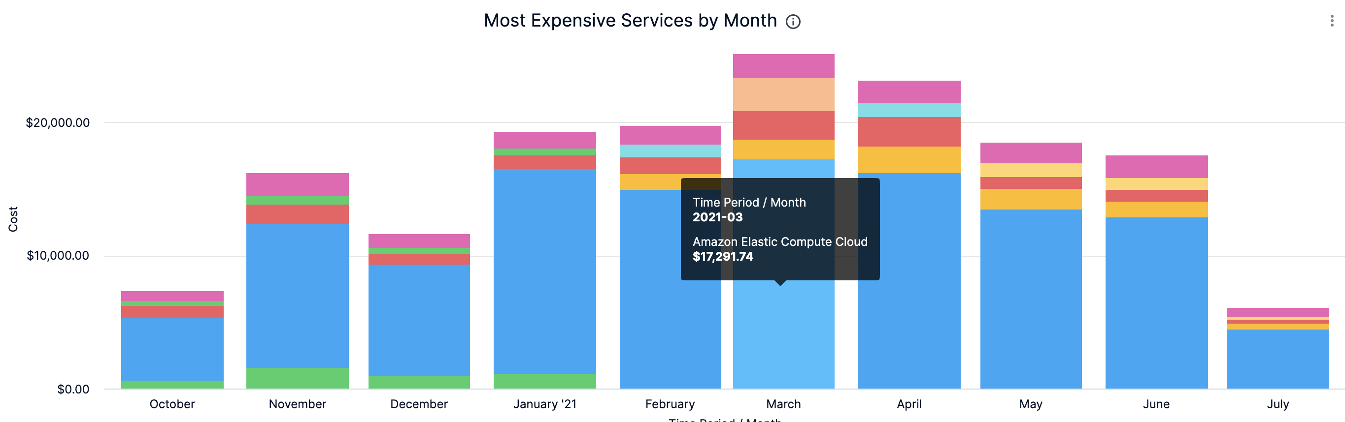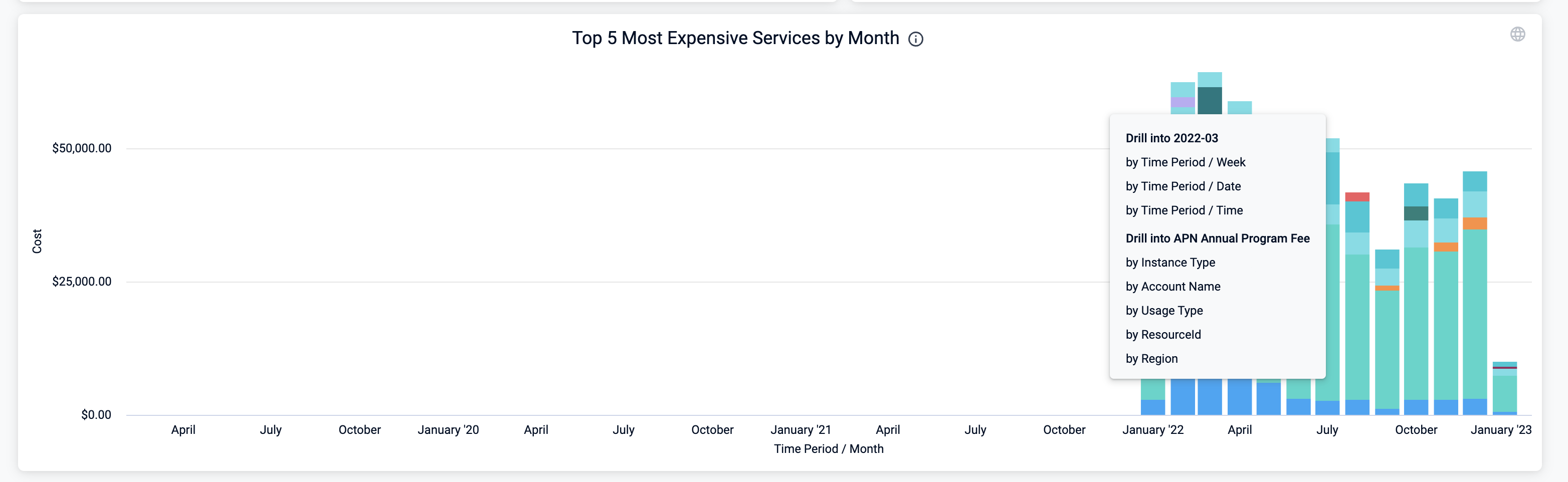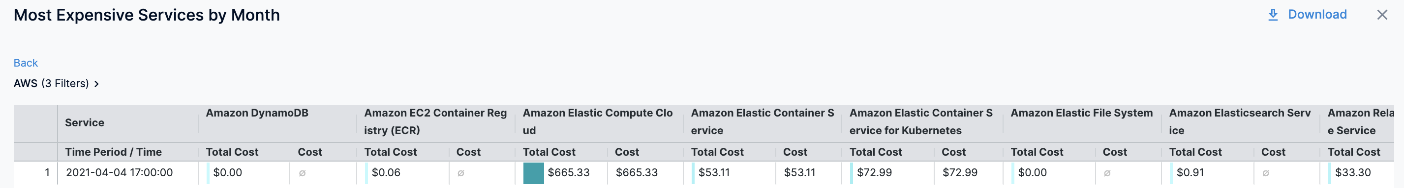 In Most Expensive Services by Month, click on the chart to further drill into the cost details:  The cost data for the selected filter is displayed.