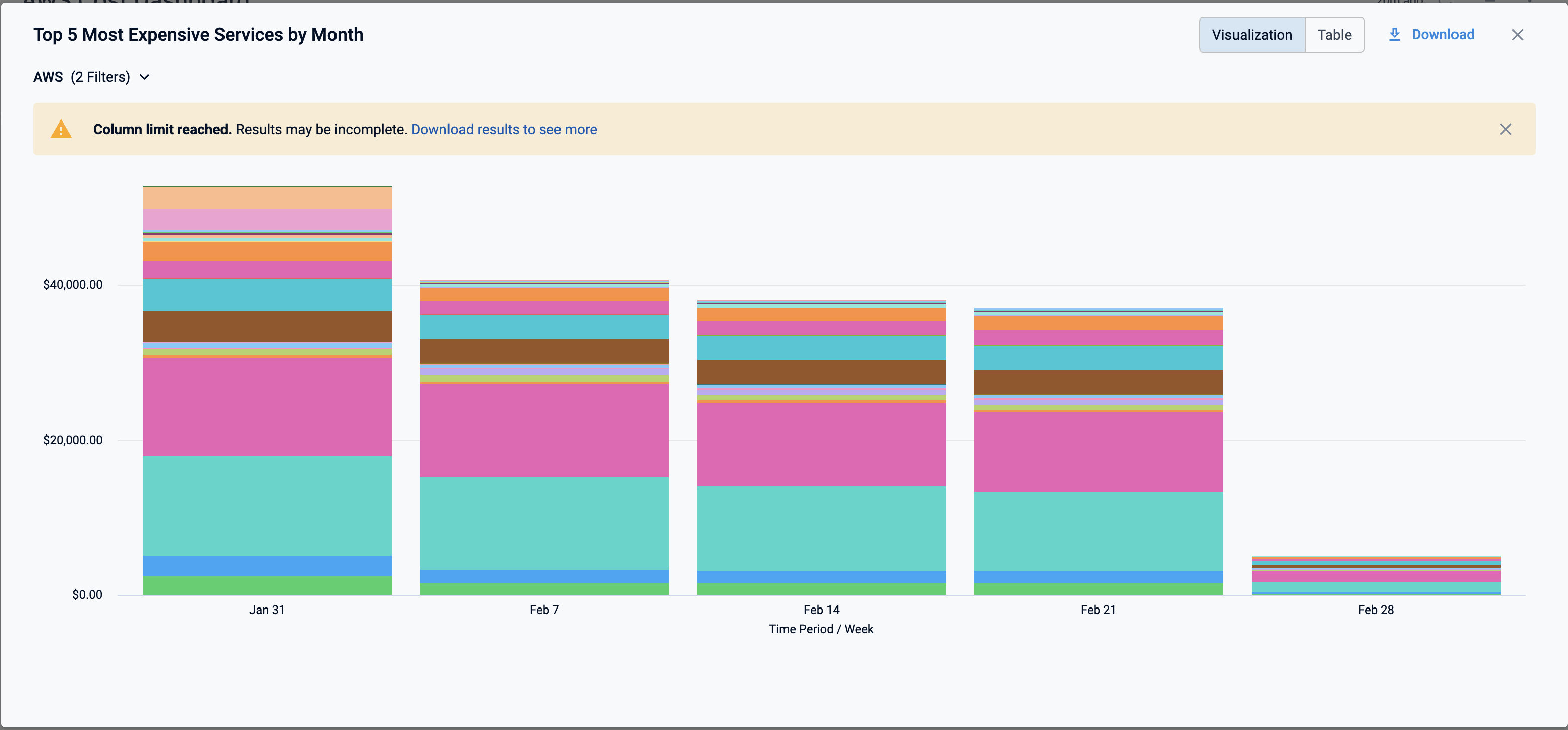 In Historical and Forecasted Cost, click on the chart to further drill into the cost details by Time Period/Time.  The cost for the selected Time period is displayed. You can toggle between the Visualization tab that displays the data in the form of a graph and the Table tab that displays the actual cost. You can download this data to your local system.