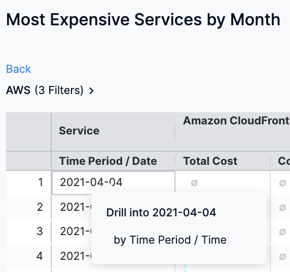 You can further drill into by Time Period/Time cost details in the resulting dashboard.  The cost data for the selected filter is displayed.