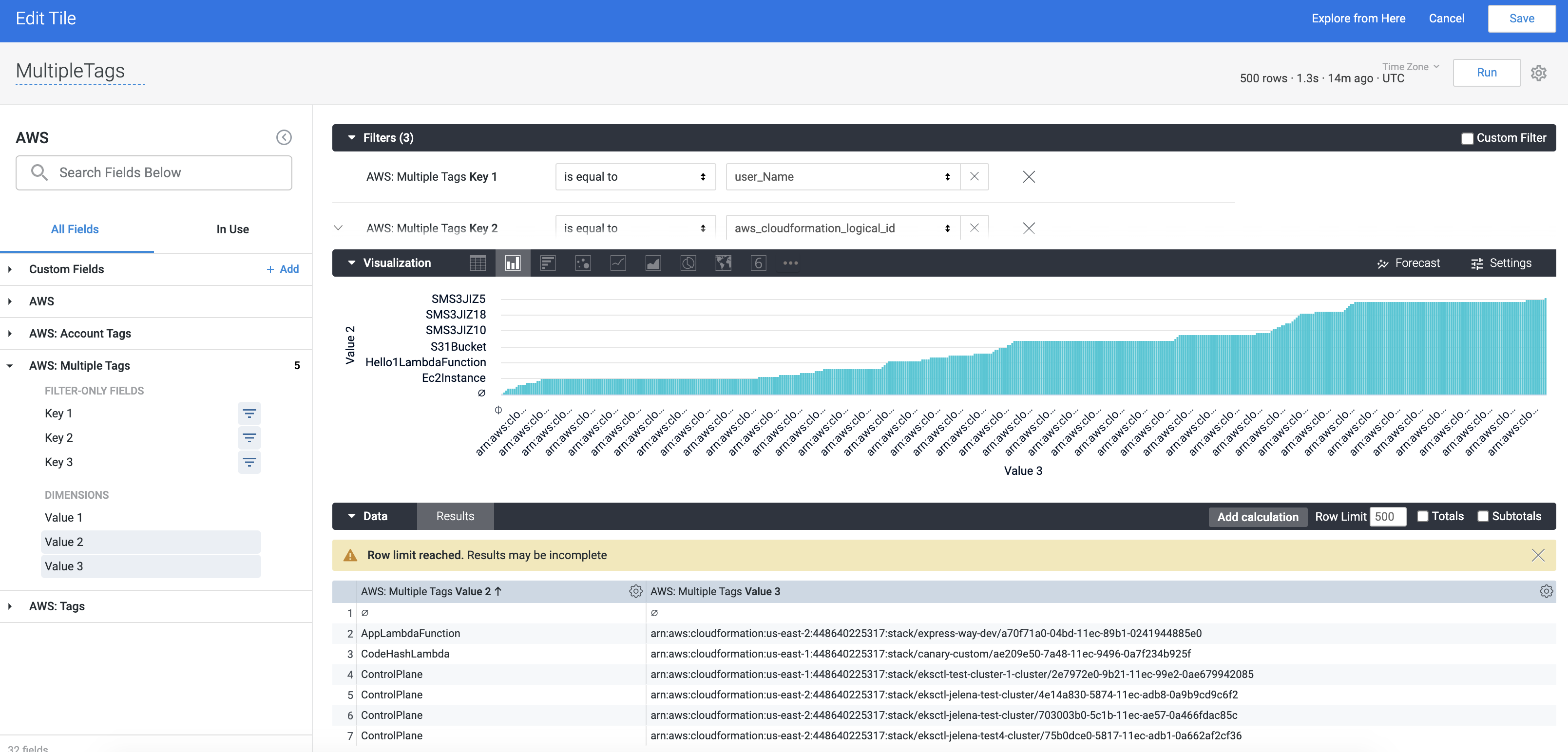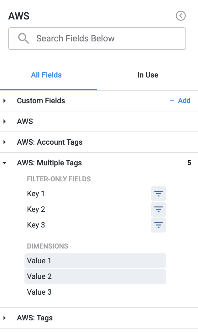 Multiple tags in AWS dashboards can be used to filter and visualize data based on unique Tags and their values. This can be used to drill down the data for specific key values. If you filter AWS: Multiple Tags - Key 1 with the environment or application, then Dimension Value 1 will contain the values for that specific Tag. For example, the cost of XYZ application in the ABC cost center in the QA environment only.
