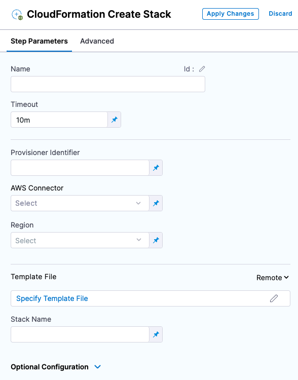 The Create Stack step is where you connect Harness to your templates and provide additional settings.