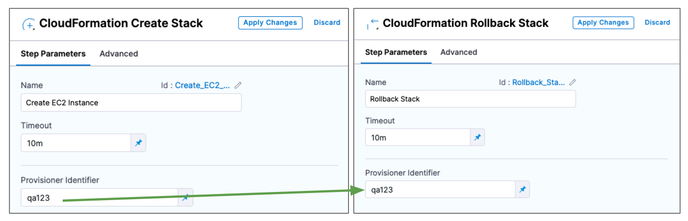 For example, in the case of a Create Stack failure, the Rollback Stack step rolls back the provisioning from the Create Stack step using its Provisioner Identifier.
