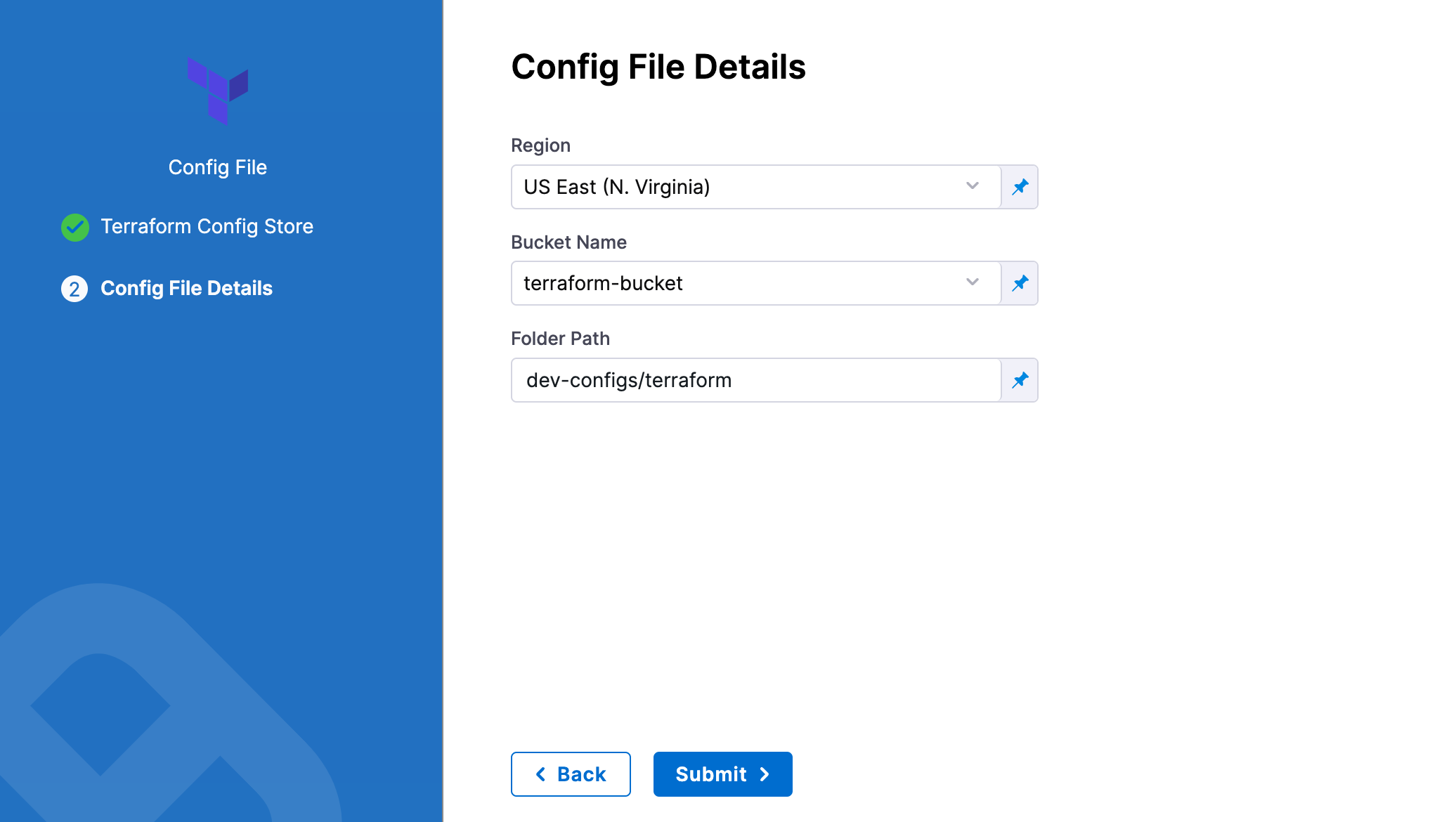 In Bucket, select the bucket where your Terraform files are stored (all buckets from the selected region that are available to the connector will be fetched).