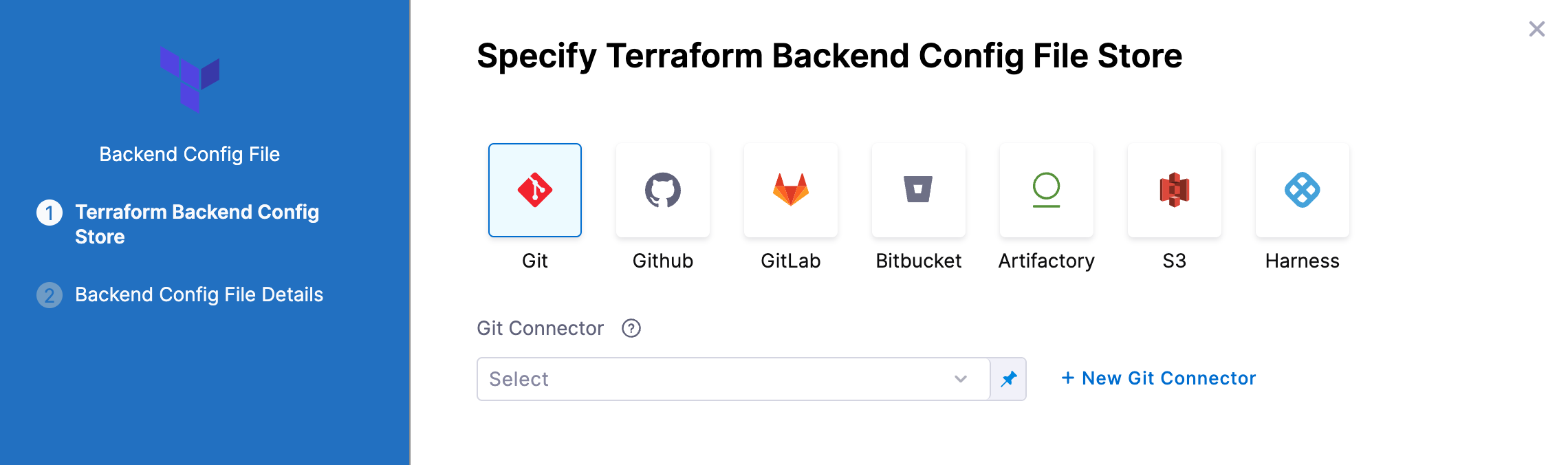 Select or create a Connector for your repo. For steps, see Connect to a Git Repo, Artifactory Connector Settings Reference or AWS Connector Settings Reference.