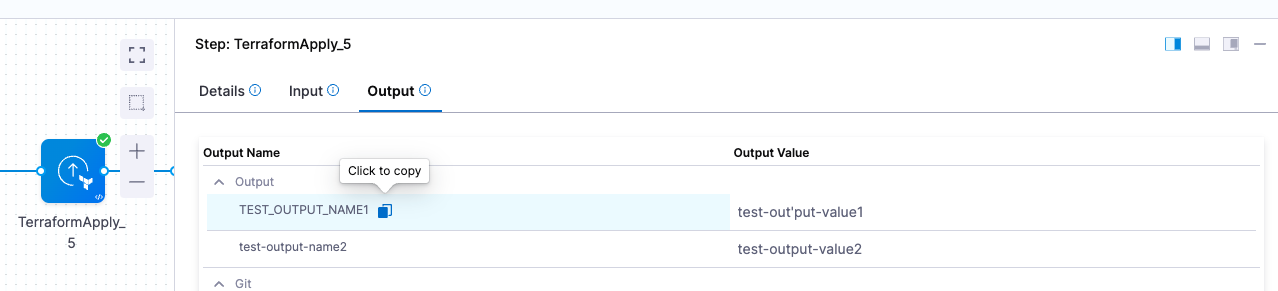 - Copy the expression. When you paste it, it will look something like <+pipeline.stages.stage1.spec.execution.steps.TerraformApply_1.output.TF_JSON_OUTPUT_ENCRYPTED>.