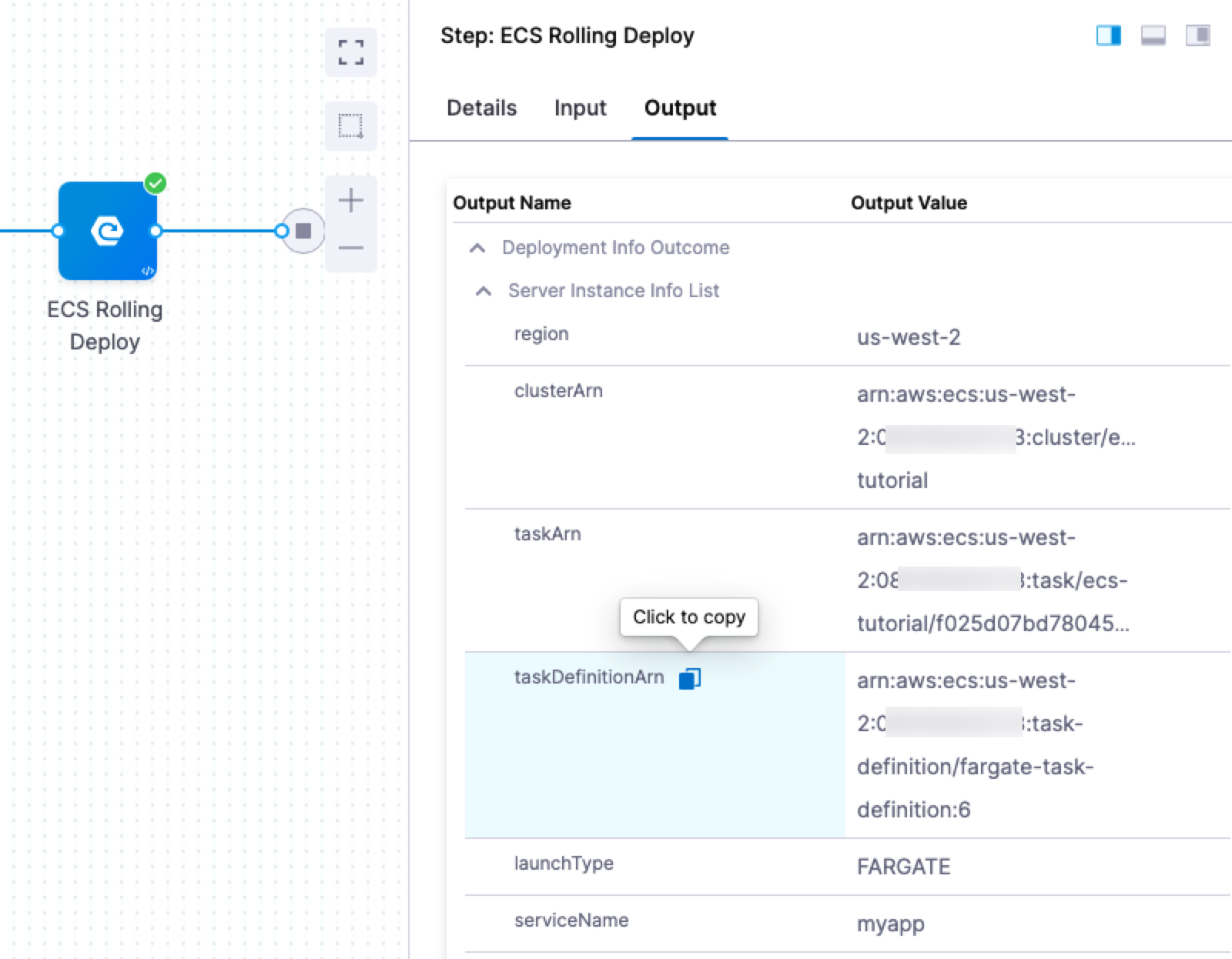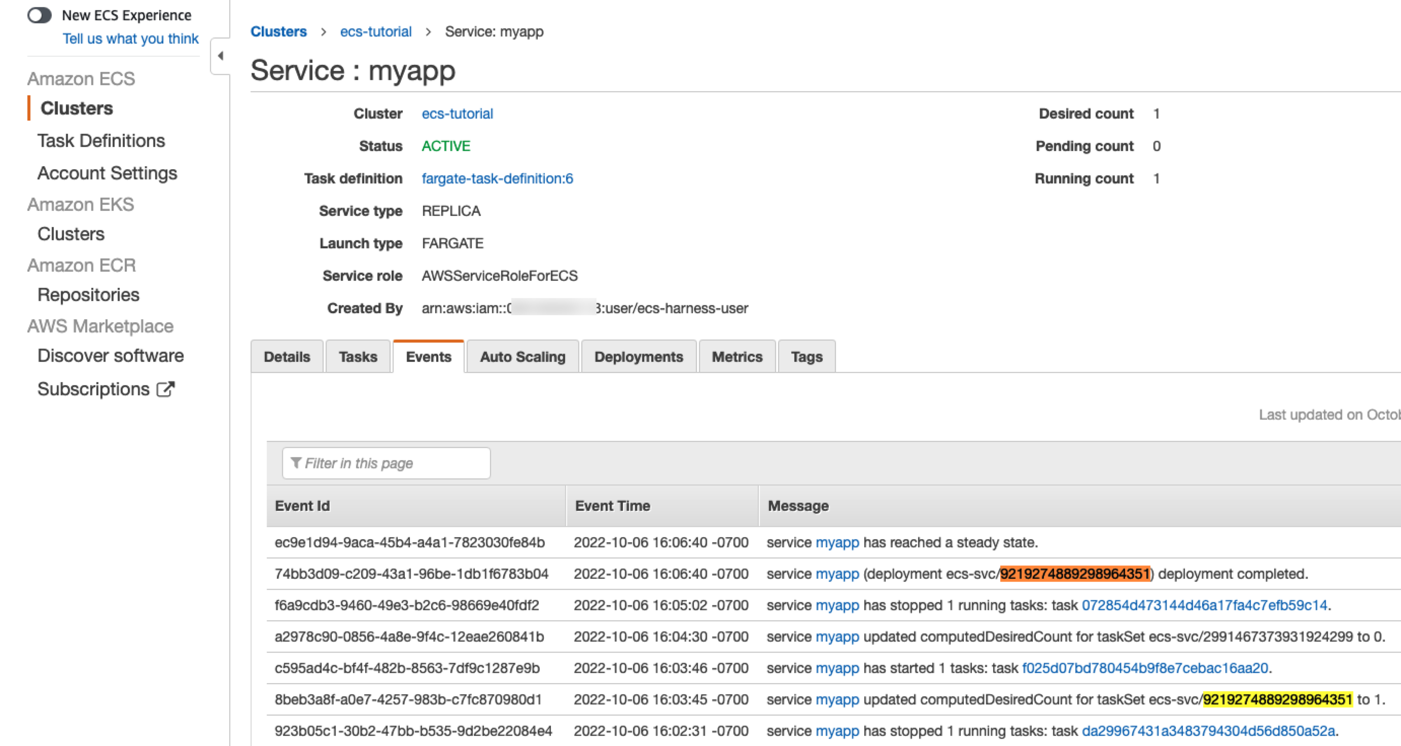 "taskDefinition": "arn:aws:ecs:us-east-1:1234567890:task-definition/tutorial-task-def:1",