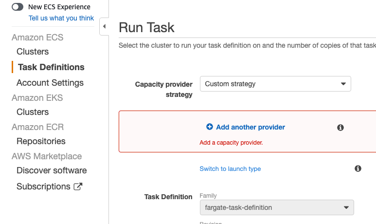 For information on running ECS Tasks, go to the AWS docs Run a standalone task in the classic Amazon ECS console, RunTask, and Amazon ECS capacity providers.