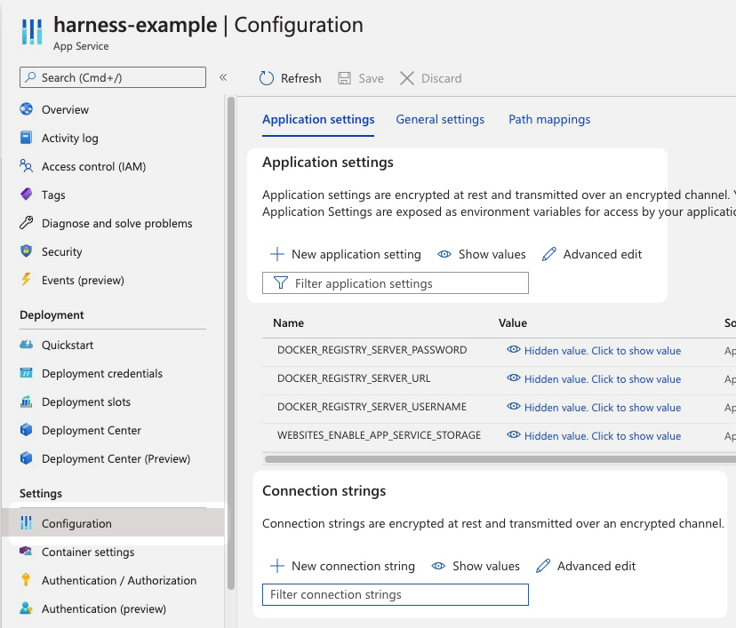 In Harness, you have the option of setting Application settings and Connection strings in the Harness Service under App Services Configuration.