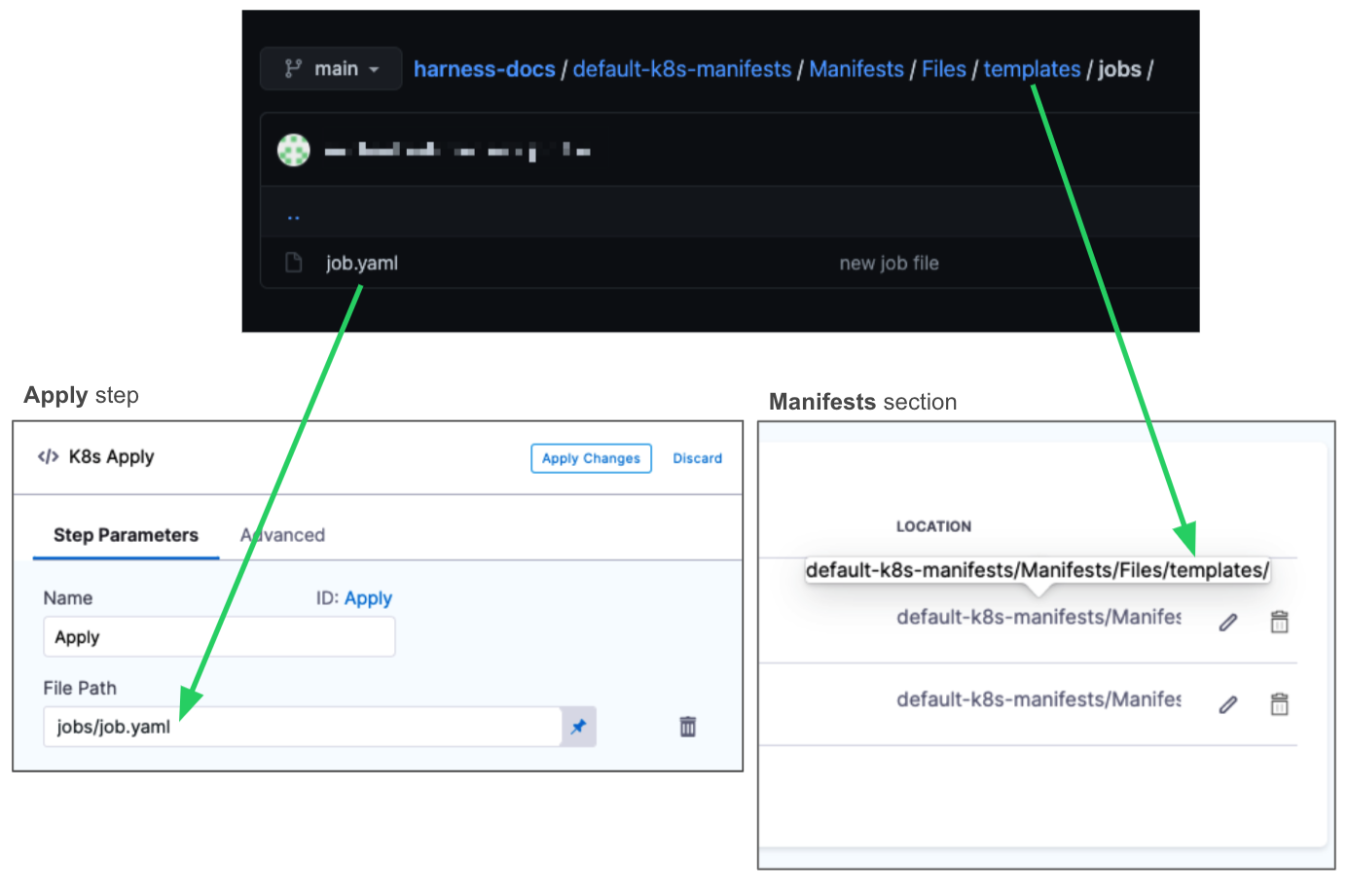 In the following example, the path used in the Manifests section of the Service Definition is default-k8s-manifests/Manifests/Files/templates/. The Apply step uses a Job manifest in the subfolder jobs/job.yaml.