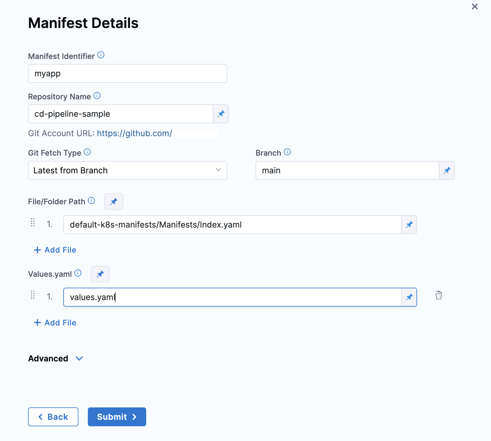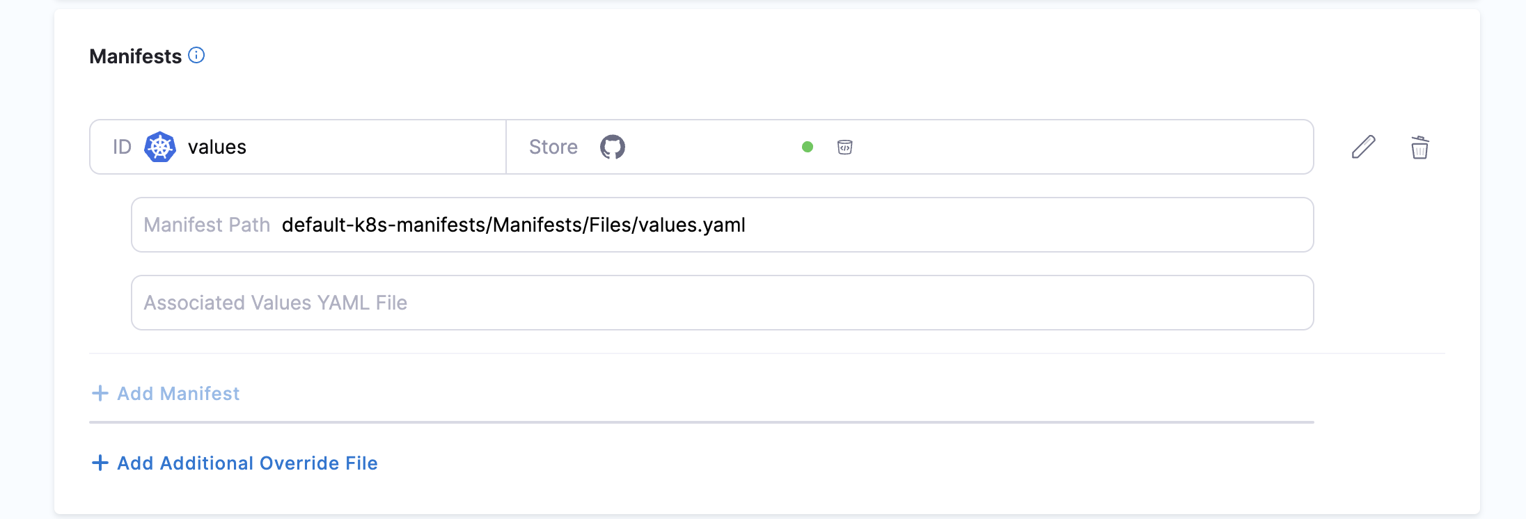 - Different repos: If the Values YAML are in a repo separate from your Kubernetes manifests or Helm Charts, or you just want to add them separately, you can them by selecting the Values YAML manifest type.