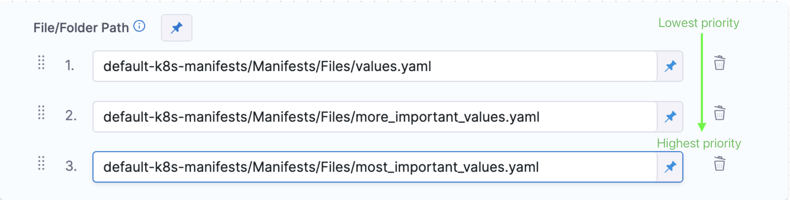 In File Path, enter the path to the values.yaml file in the repo. You can enter multiple values file paths by clicking Add File. At runtime, Harness will compile the files into one values file. If you use multiple files, the highest priority is given from the last file, and the lowest priority to the first file. For example, if you have 3 files and the second and third files contain the same key:valueas the first file, the third file'skey:valueoverrides the second and first files.