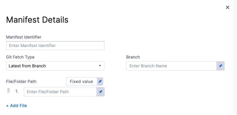 In Manifest Identifier, enter an Id for the manifest. It must be unique. It can be used in Harness expressions to reference this manifests settings. For example, if the Pipeline is named MyPipeline and Manifest Identifier were myapp, you could reference the Branch setting using this expression: <+pipeline.stages.MyPipeline.spec.serviceConfig.serviceDefinition.spec.manifests.myapp.spec.store.spec.branch>
