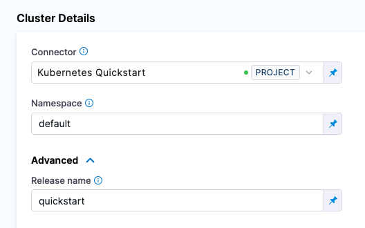 In Advanced, in Release name, enter quickstart. For a release name, you can use a built-in or custom expression or any text you like. Harness requires a release name for tracking. It is applied to the pods as a label. The release name must be unique across the cluster.