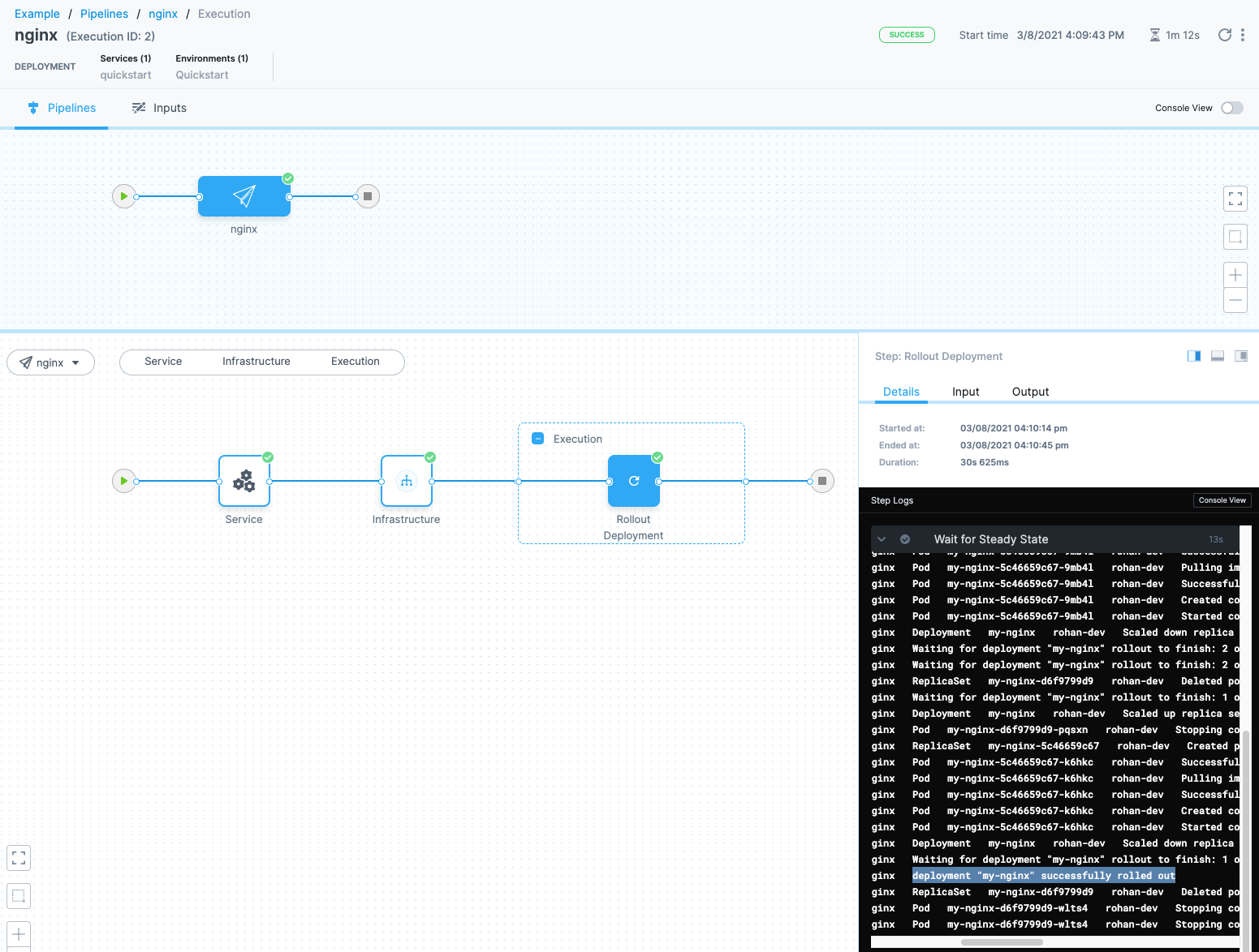 Toggle Console View to watch the deployment with more detailed logging. Select the Rollout Deployment step and expand Wait for Steady State. You can see deployment "my-nginx" successfully rolled out.