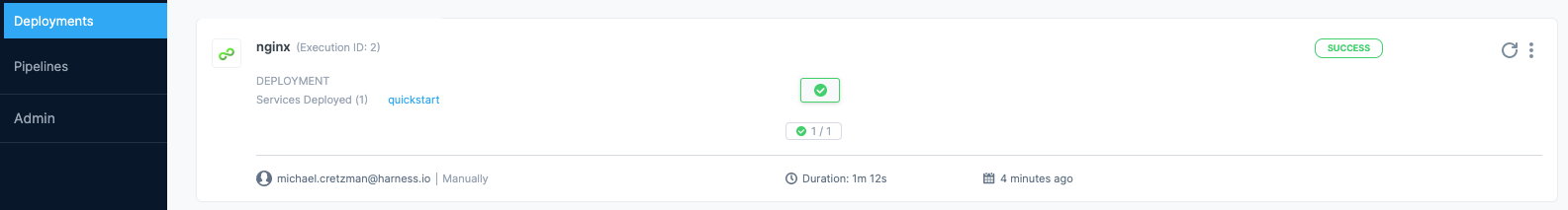 Select Run Pipeline. Harness will verify the Pipeline and then run it. You can see the status of the deployment, and pause or abort it.