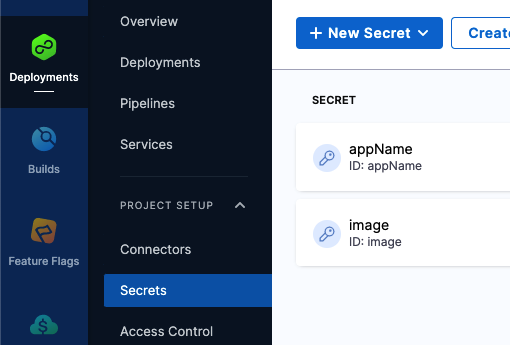 The following patch uses these secrets for image and app, referencing them using the expression <+secrets.getValue("[secret name]")>.