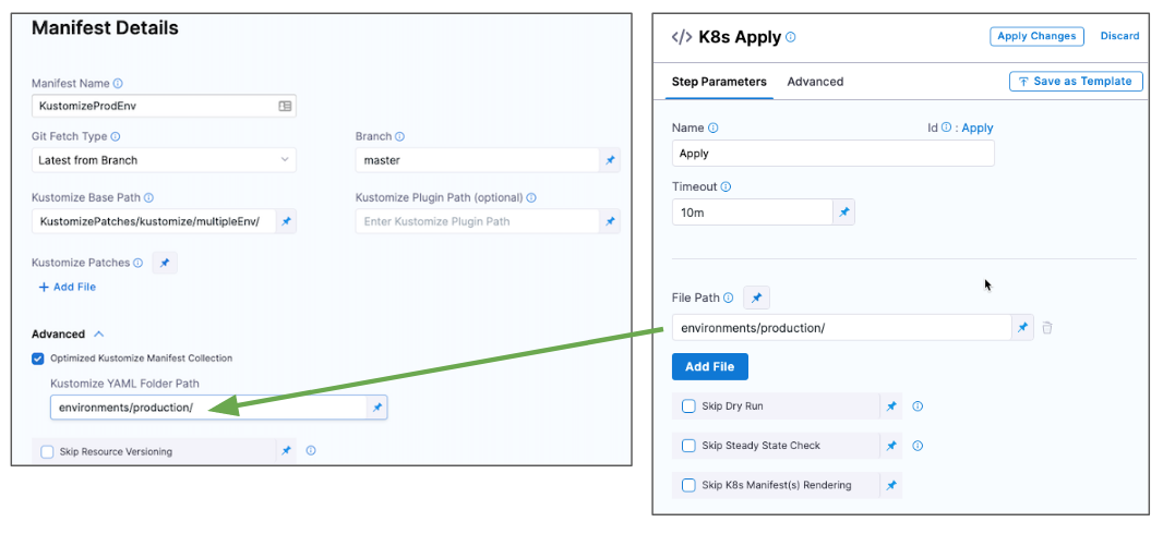 * Optimized Kustomize Manifest Collection: When the Optimized Kustomize Manifest Collection option is enabled in Manifest Details, the Apply step File Path must be the same path as Kustomize YAML Folder Path.