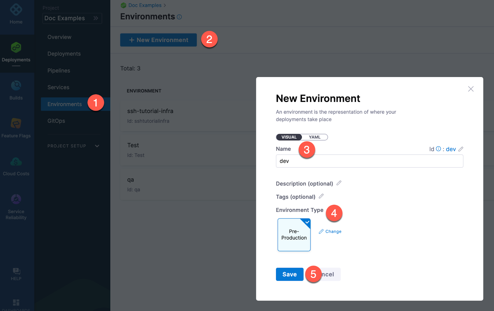 Environments represent your deployment targets (QA, Prod, etc). Each environment contains one or more Infrastructure Definitions that list your target clusters, hosts, namespaces, etc.