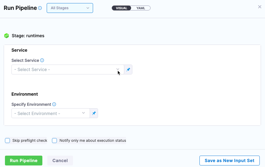 When you run the pipeline, you can select the service and environment for their runtime inputs.