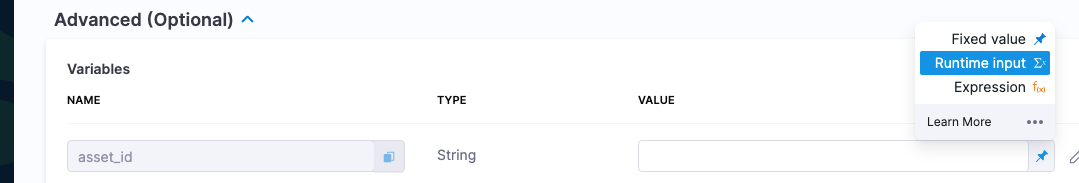 For variable Value, select Runtime Input:  Later, when you run the pipeline, you'll provide a new value for this variable, and that value will be used to update the config.jsonfile.