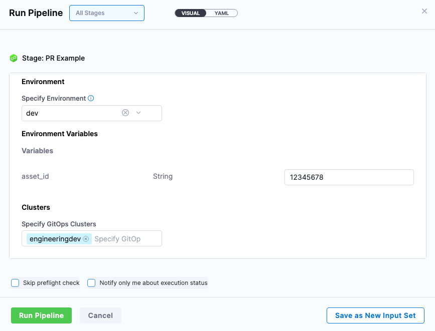 For the stage environment, we'll use a Harness runtime input. When you run the pipeline, Harness will prompt you for a value for the environment. You can select the environment you want to use for the PR. You can also use Expressions here. The value provided for the environment expression will propagate through all the PR steps. Note: only expressions that resolves to strings are valid and considered during execution. -