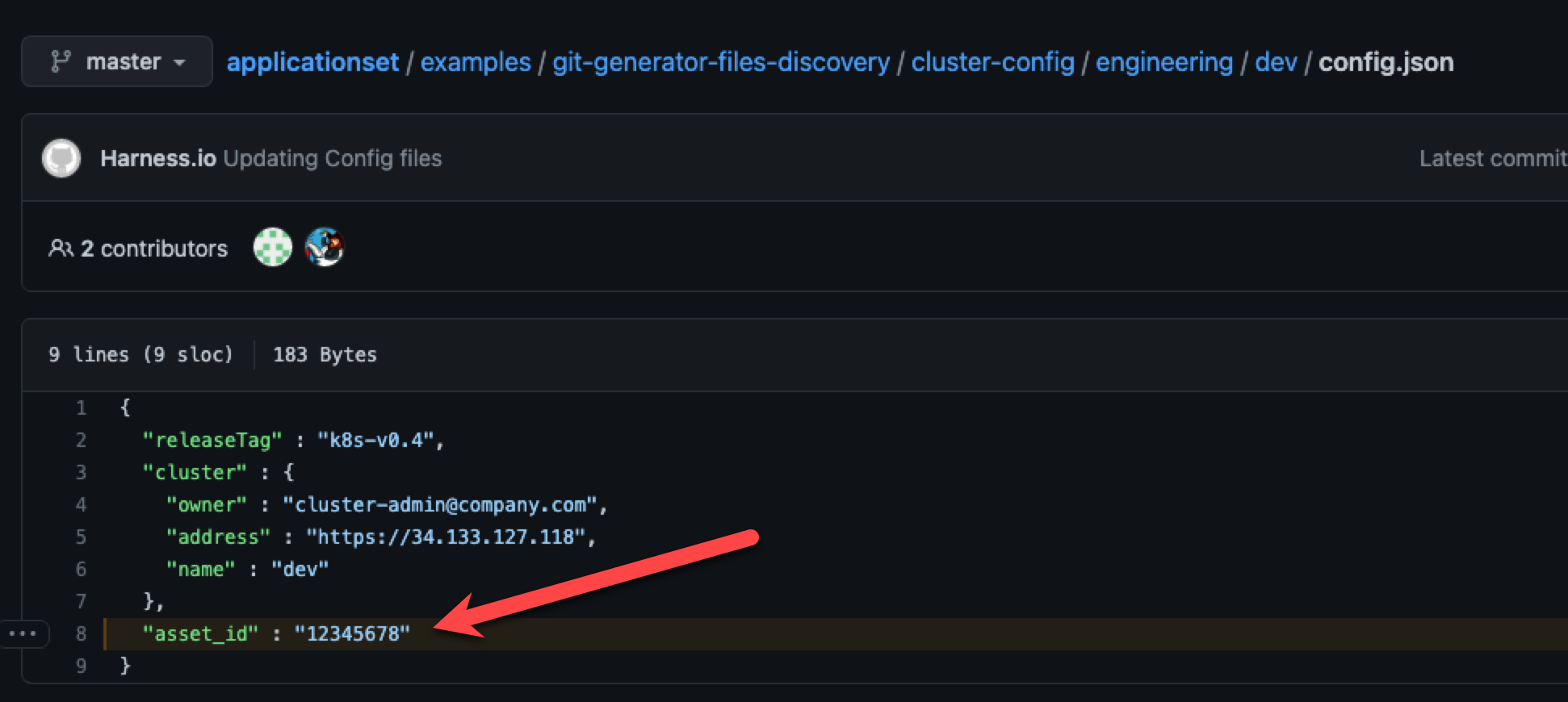 - Check the repo to see that the config.jsonfile for the dev environment has been updated with the new asset_id value: