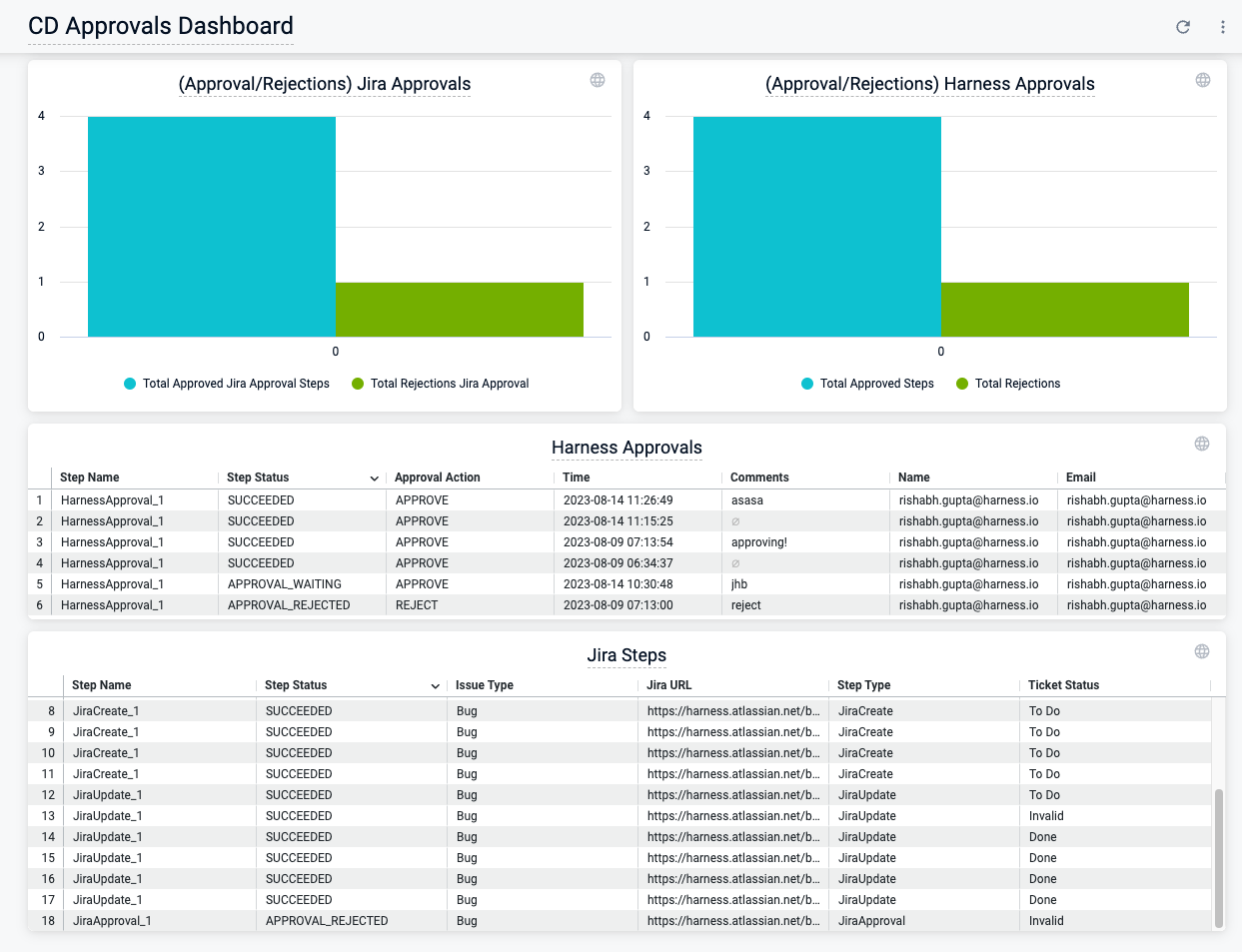Harness CD includes an extensive set of dashboard components that provide visibility into your Harness and Jira approvals. You can create custom dashbards that quickly answer questions such as:
