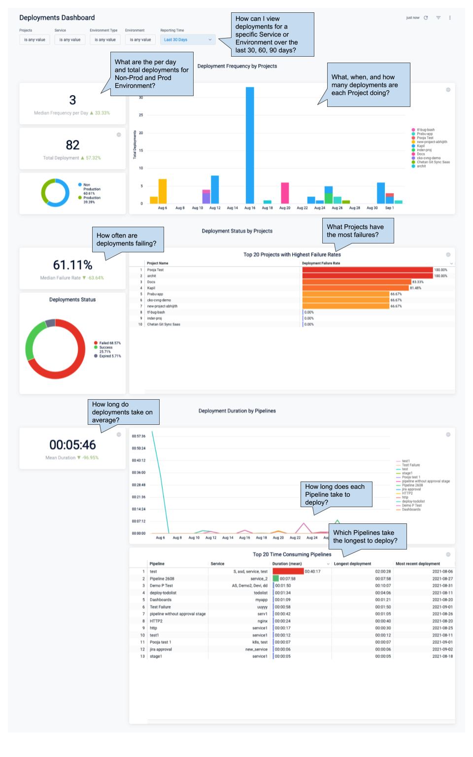 Harness CD includes an extensive set of dashboard components that provide visibility into the performance of your deployment pipelines. You can create custom dashboards to answer questions such as: