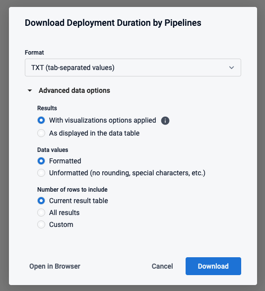 Deployments: each deployment to a selected environment or environment group. If you filter using My Deployments you see only those deployments that your user account initiated.