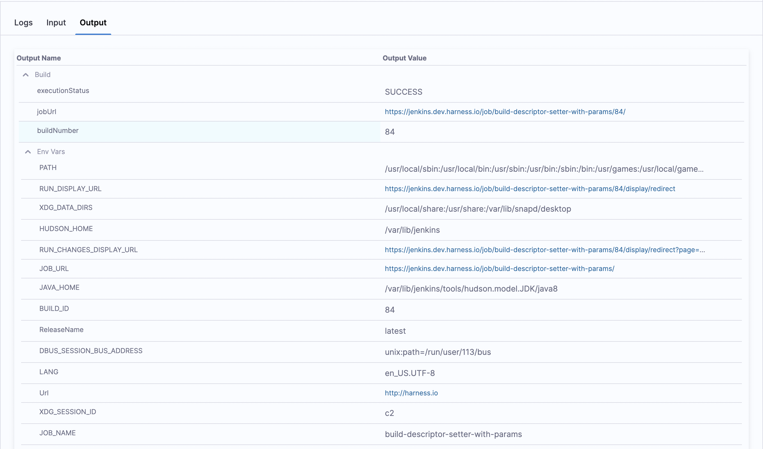 Any Jenkins job information in the particular shell session of the pipeline can be captured and output using one or more Jenkins steps. In addition, you can capture information available using the built-in Harness variables. For more information, go to Use Harness expressions.