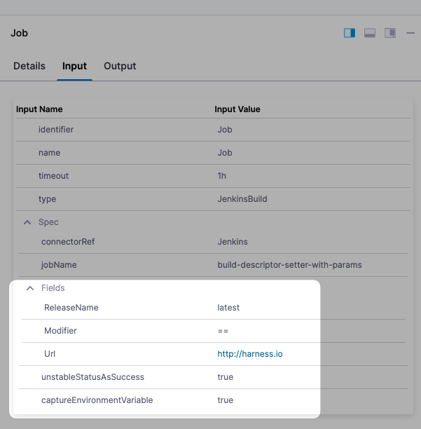 | Job parameters from Jenkins step | Executed Jenkins step inputs |