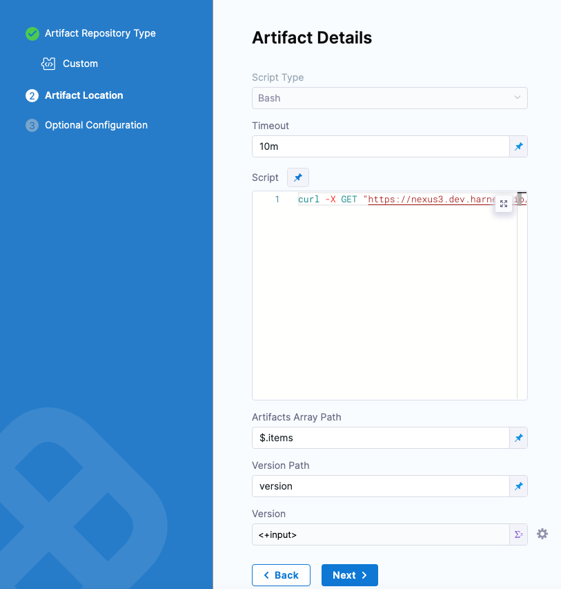 Script: Enter a script to fetch a JSON payload and add it to the Harness variable $HARNESS_ARTIFACT_RESULT_PATH.Here's an example: curl -X GET "https://nexus3.dev.harness.io/service/rest/v1/components?repository=cdp-qa-automation-1" -H "accept: application/json" > $HARNESS_ARTIFACT_RESULT_PATHThe shell script you enter will query the Custom Artifact repository and output the JSON payload to a file on the Harness Delegate host using the environment variable HARNESS_ARTIFACT_RESULT_PATH, initialized by Harness.HARNESS_ARTIFACT_RESULT_PATHis a random, unique file path created on the Delegate by Harness.You can use Harness text secrets in the script. For example: curl -u 'harness' <+secrets.getValue("repo_password")> https://myrepo.example.io/todolist/json/ > $HARNESS_ARTIFACT_RESULT_PATHYou must delete the Artifact Source and re-add it to re-collect the artifacts if the Artifact Source or its script information has been changed.