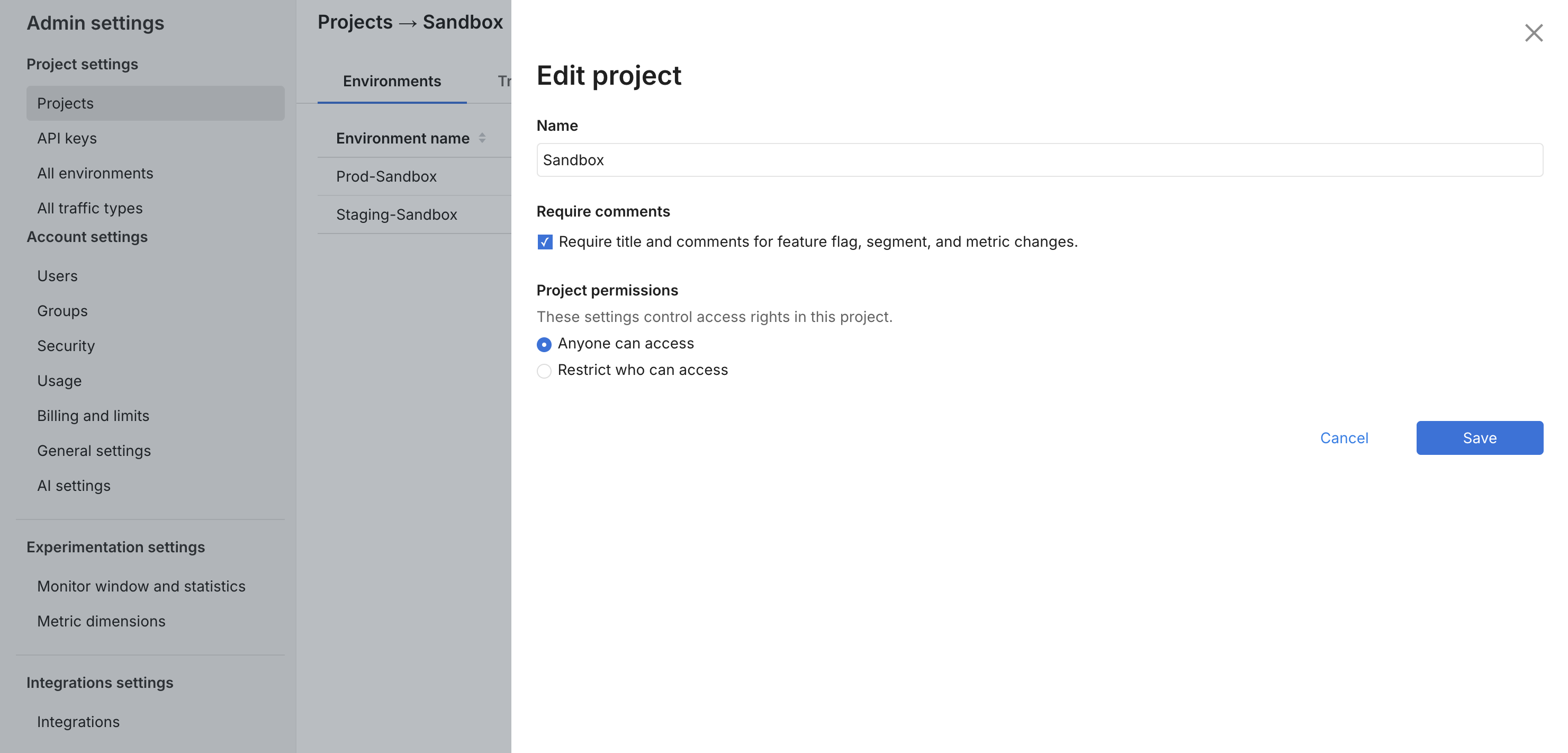 If checked, it is required to provide a title and comment when changing the feature flag definition, in the user interface and Admin API.