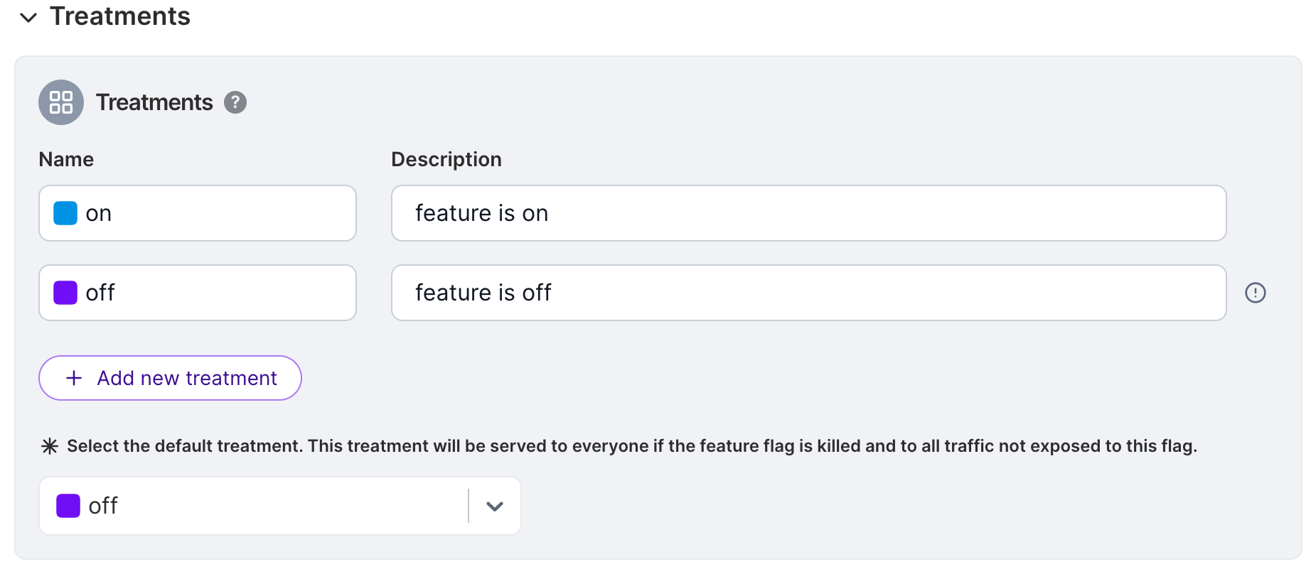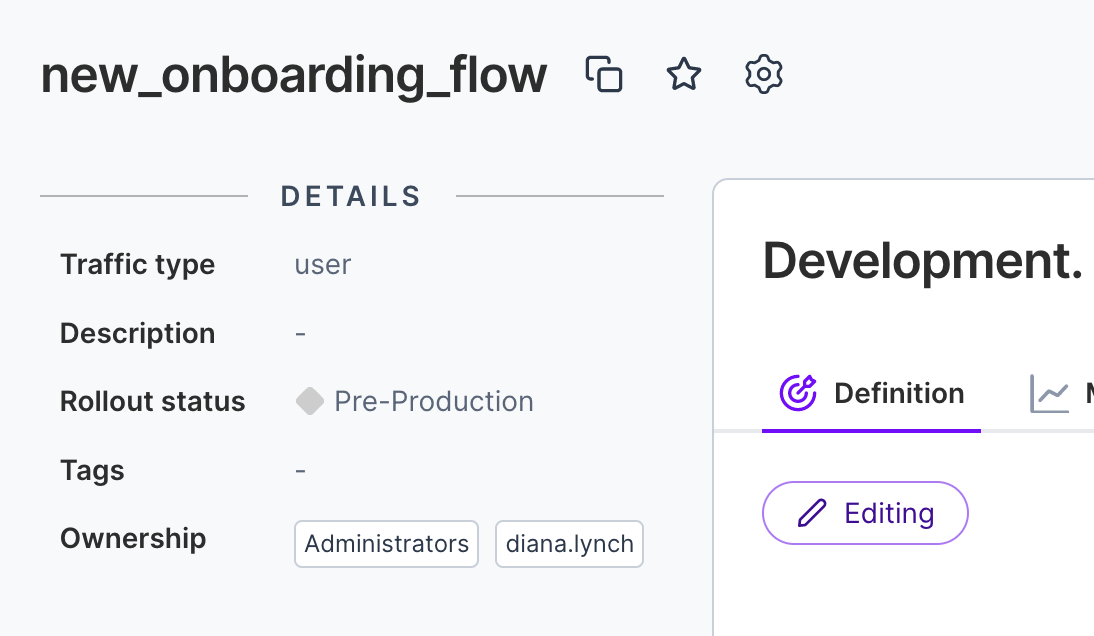 This is an important item to note. Feature flags exist at a project level but their definition, including targeting rules, exist individually in each feature flag environment. Colloquially, the environment level feature flag is referred to as a meta-feature flag. The rollout status, feature flag name, traffic type, tags, description, and feature flag owners exist at the project level. The rest of the feature flag is defined per environment.