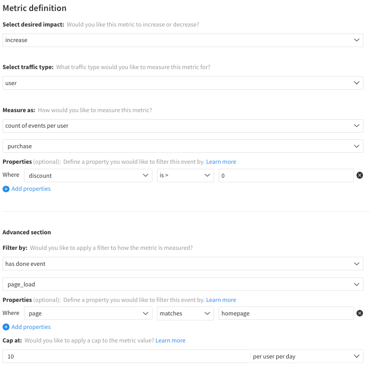 | Metric aggregation | string | TOTAL : Metric is a sum of values COUNT : Metric is a count of values RATE : Metric measures the percent of the sample who have done the event AVERAGE : Metric is an average of values NONE : Metric definition unknown |