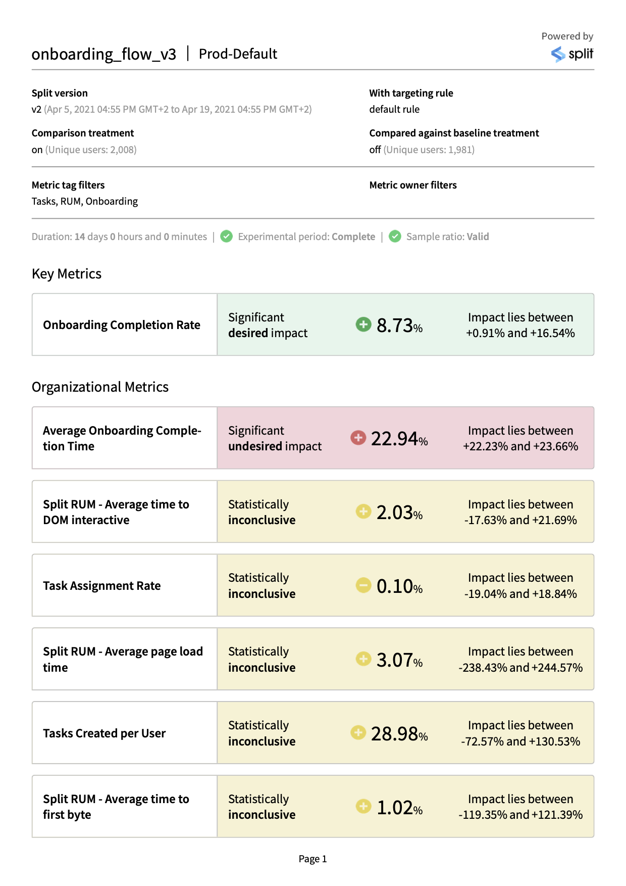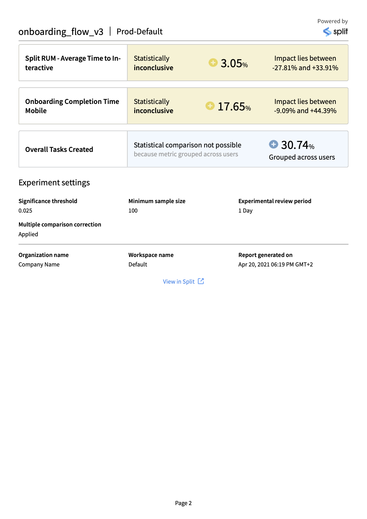 PDF: This format presents a visual representation of your metrics impact results, similar to the Split UI. This format is ideal for sharing results with stakeholders and for quickly understanding the high level outcomes of your tests. An example PDF report is shown below.